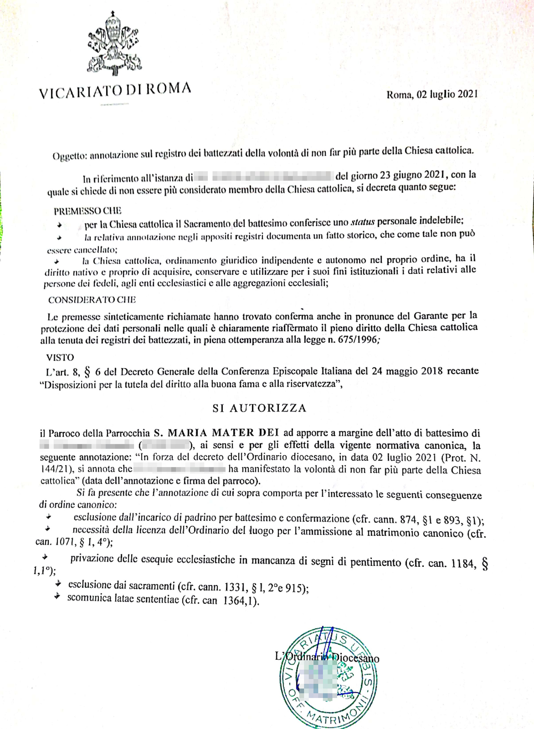 Una persona ha chiesto la rettifica dei dati relativi al proprio battesimo avvenuto a S. Maria Mater Dei - ROMA (RM) il 02/07/2021, dichiarando di non voler più far parte della Chiesa Cattolica.