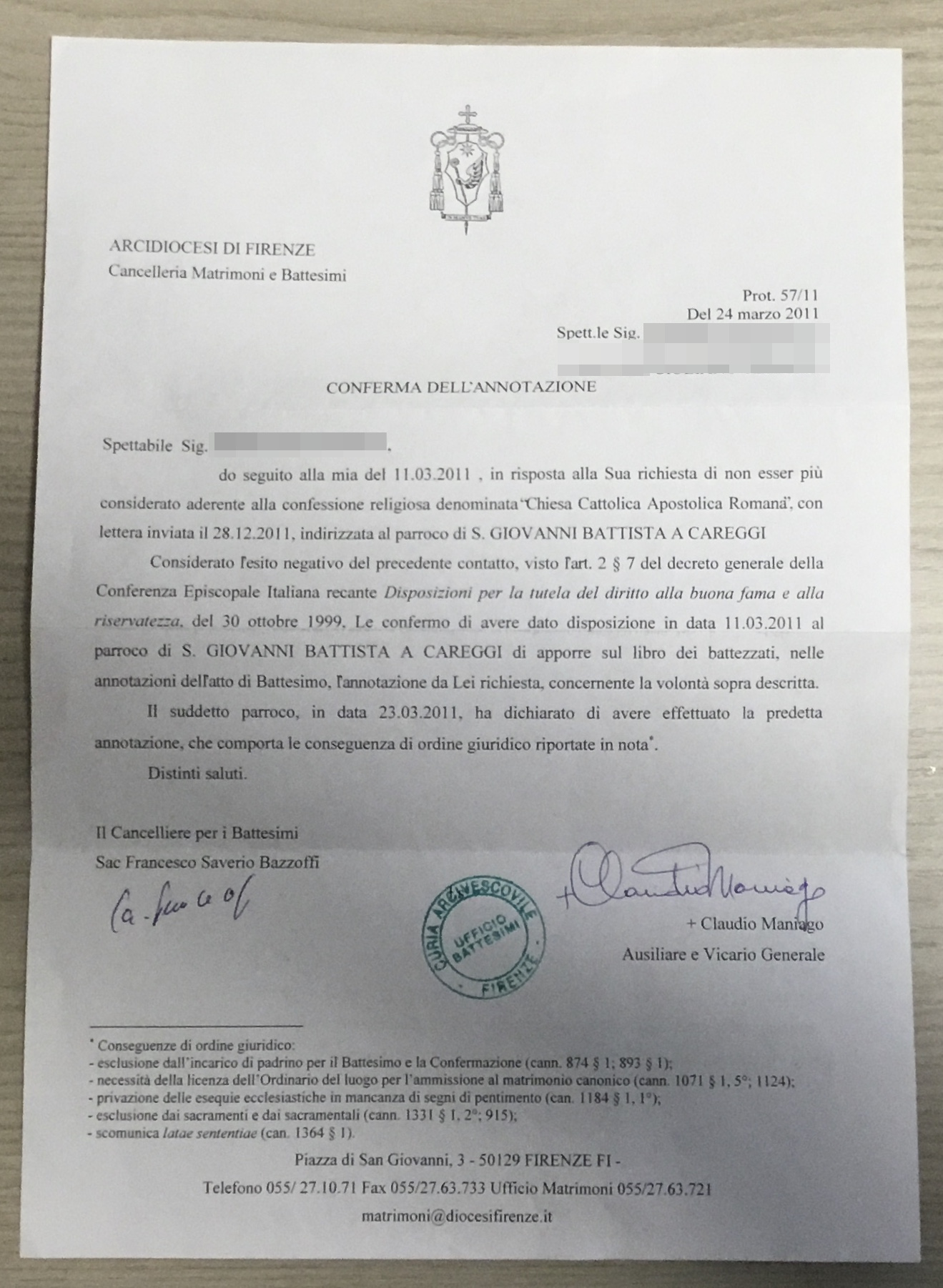 Una persona ha chiesto la rettifica dei dati relativi al proprio battesimo avvenuto a S. Giovanni Battista Nell'ospedale di Careggi - FIRENZE (FI) il 24/03/2011, dichiarando di non voler più far parte della Chiesa Cattolica.