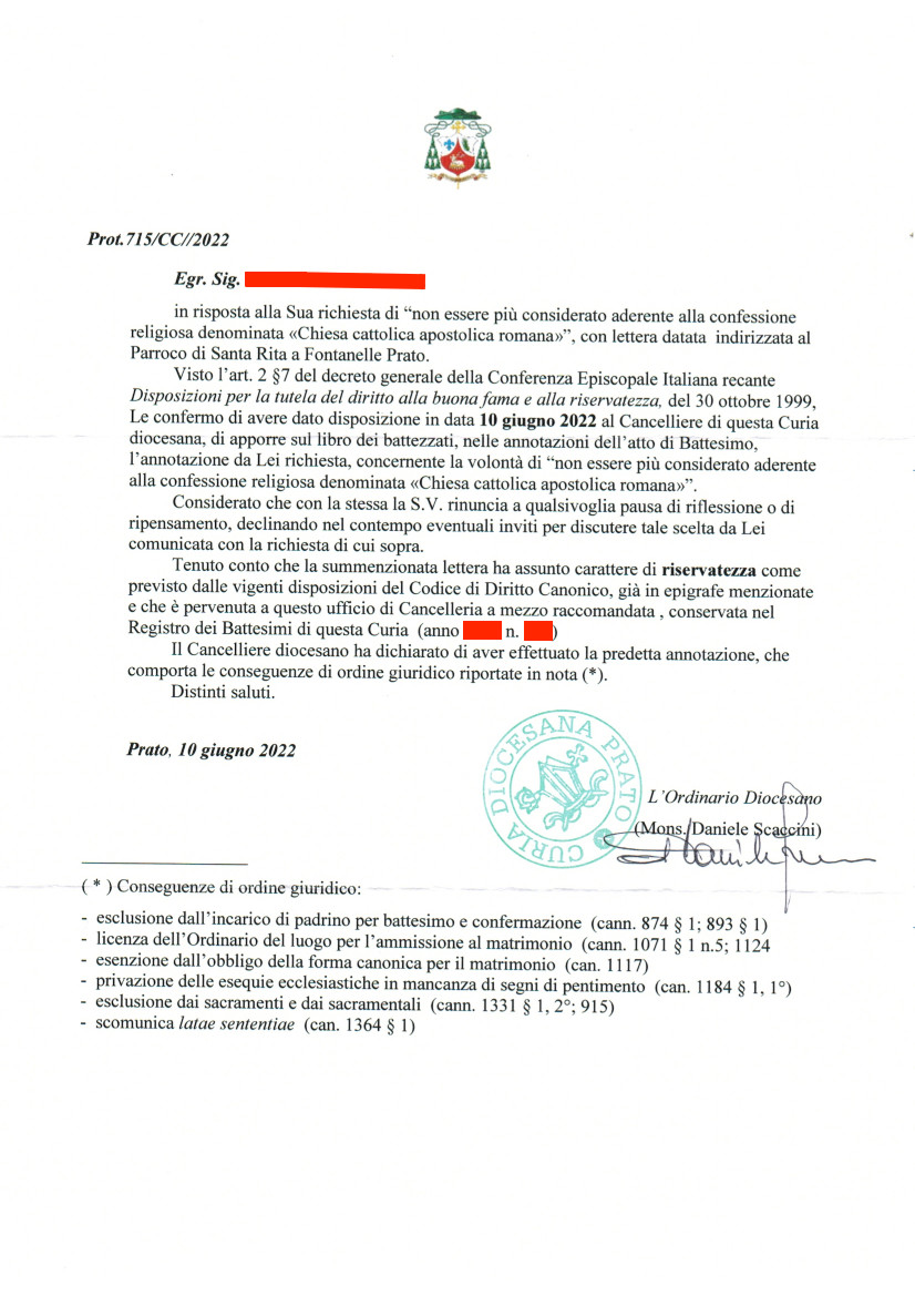 Una persona ha chiesto la rettifica dei dati relativi al proprio battesimo avvenuto a S. Rita - PRATO (PO) il 10/05/2022, dichiarando di non voler più far parte della Chiesa Cattolica.
