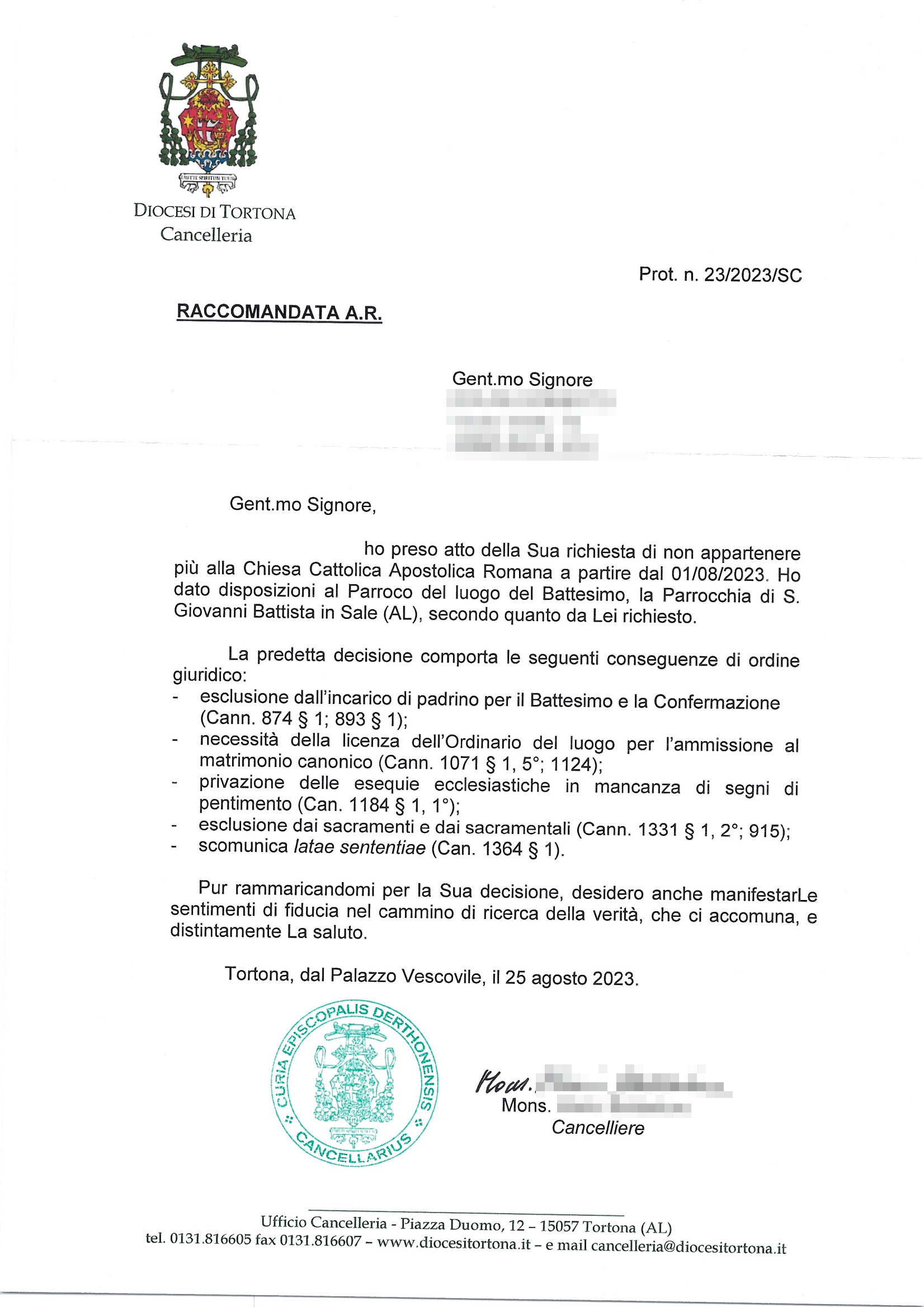Una persona ha chiesto la rettifica dei dati relativi al proprio battesimo avvenuto a S. Giovanni Battista - SALE (AL) il 25/08/2023, dichiarando di non voler più far parte della Chiesa Cattolica.