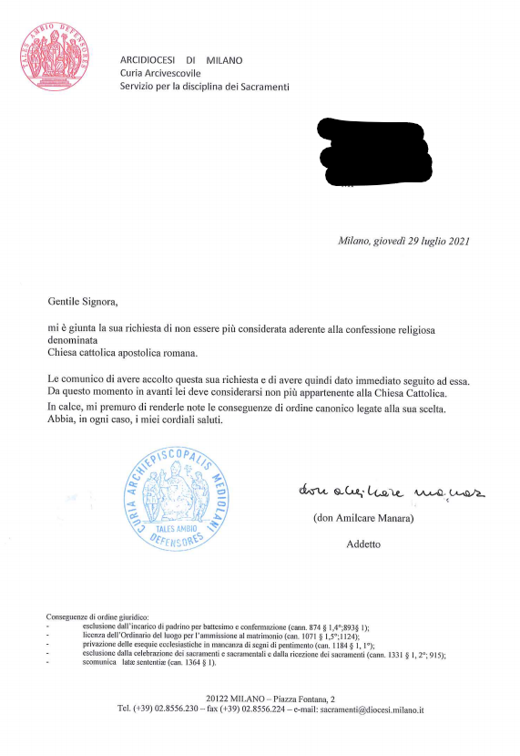 Una persona ha chiesto la rettifica dei dati relativi al proprio battesimo avvenuto a Santi Mm. Nabore e Felice - MILANO (MI) il 06/08/2021, dichiarando di non voler più far parte della Chiesa Cattolica.
