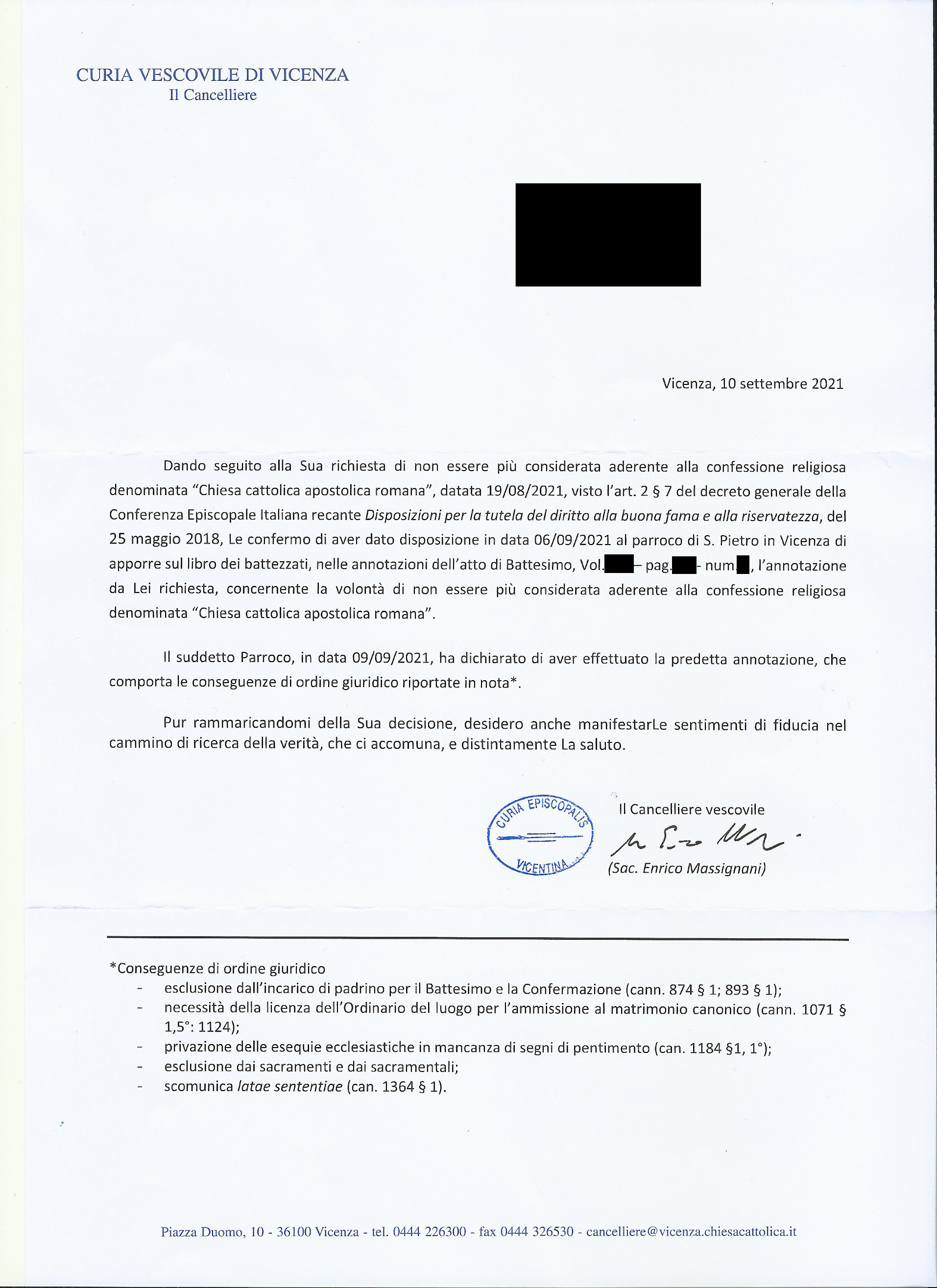 Una persona ha chiesto la rettifica dei dati relativi al proprio battesimo avvenuto a S. Pietro Apostolo - VICENZA (VI) il 15/09/2021, dichiarando di non voler più far parte della Chiesa Cattolica.