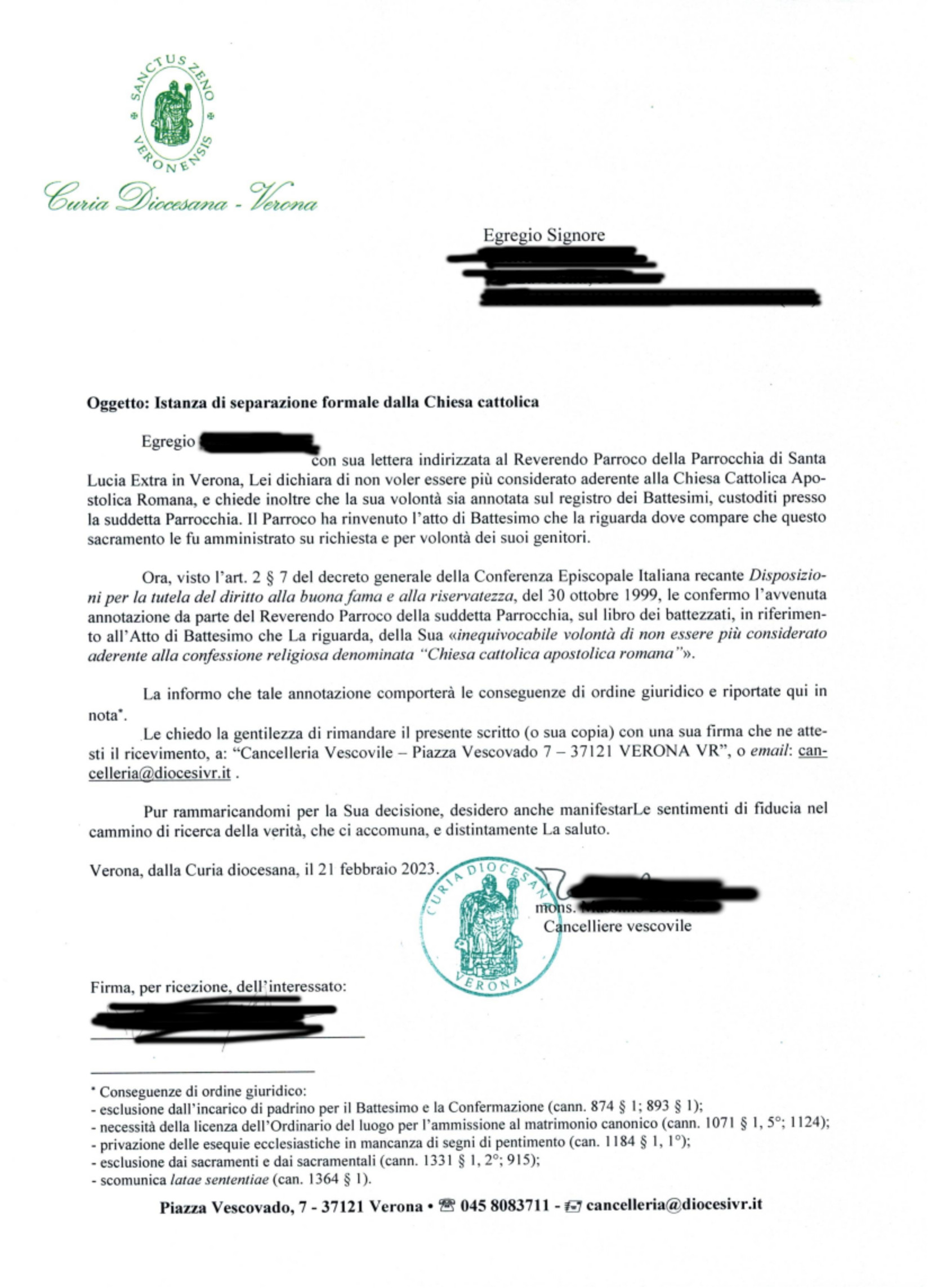 Una persona ha chiesto la rettifica dei dati relativi al proprio battesimo avvenuto a Santa Lucia Extra - VERONA (VR) il 21/02/2023, dichiarando di non voler più far parte della Chiesa Cattolica.