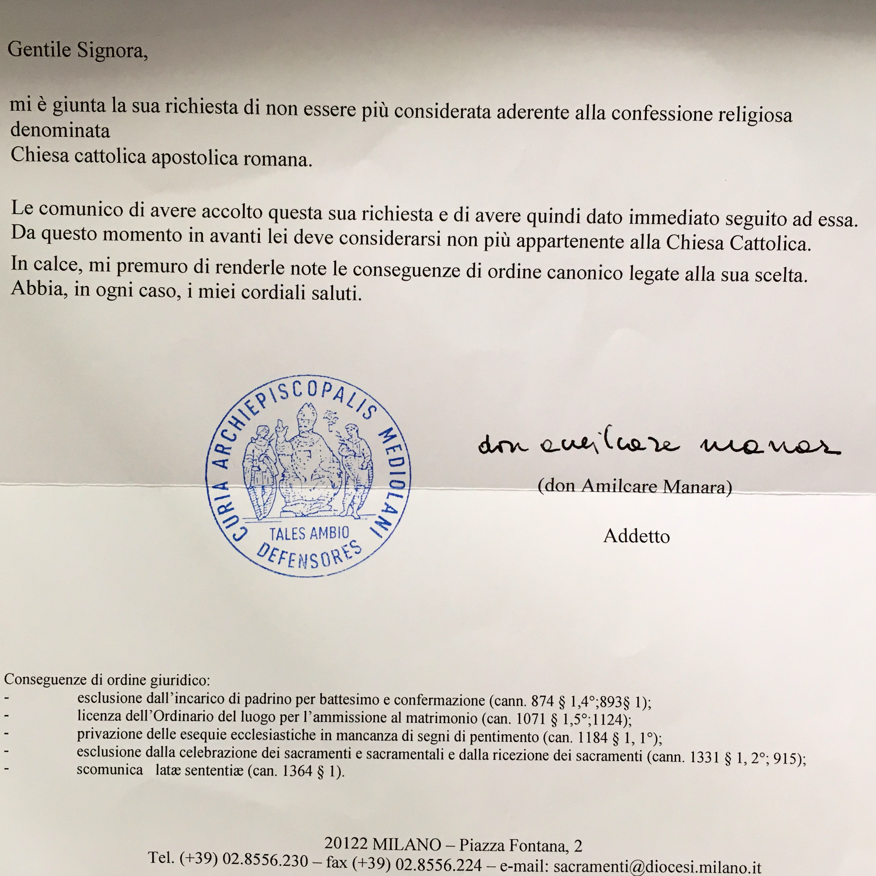 Una persona ha chiesto la rettifica dei dati relativi al proprio battesimo avvenuto a Santi Carlo e Anna - SEGRATE (MI) il 27/07/2021, dichiarando di non voler più far parte della Chiesa Cattolica.