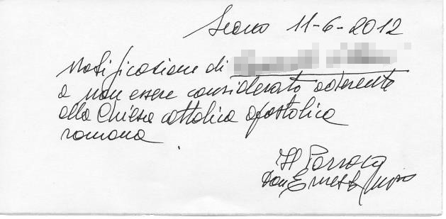 Una persona ha chiesto la rettifica dei dati relativi al proprio battesimo avvenuto a S. Pietro Apostolo in Seano - CARMIGNANO (PO) il 11/06/2012, dichiarando di non voler più far parte della Chiesa Cattolica.