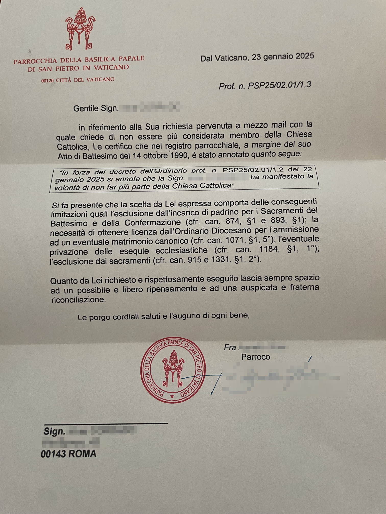 Una persona ha chiesto la rettifica dei dati relativi al proprio battesimo avvenuto a San Pietro in Vaticano - CITTÀ DEL VATICANO il 23/01/2025, dichiarando di non voler più far parte della Chiesa Cattolica.