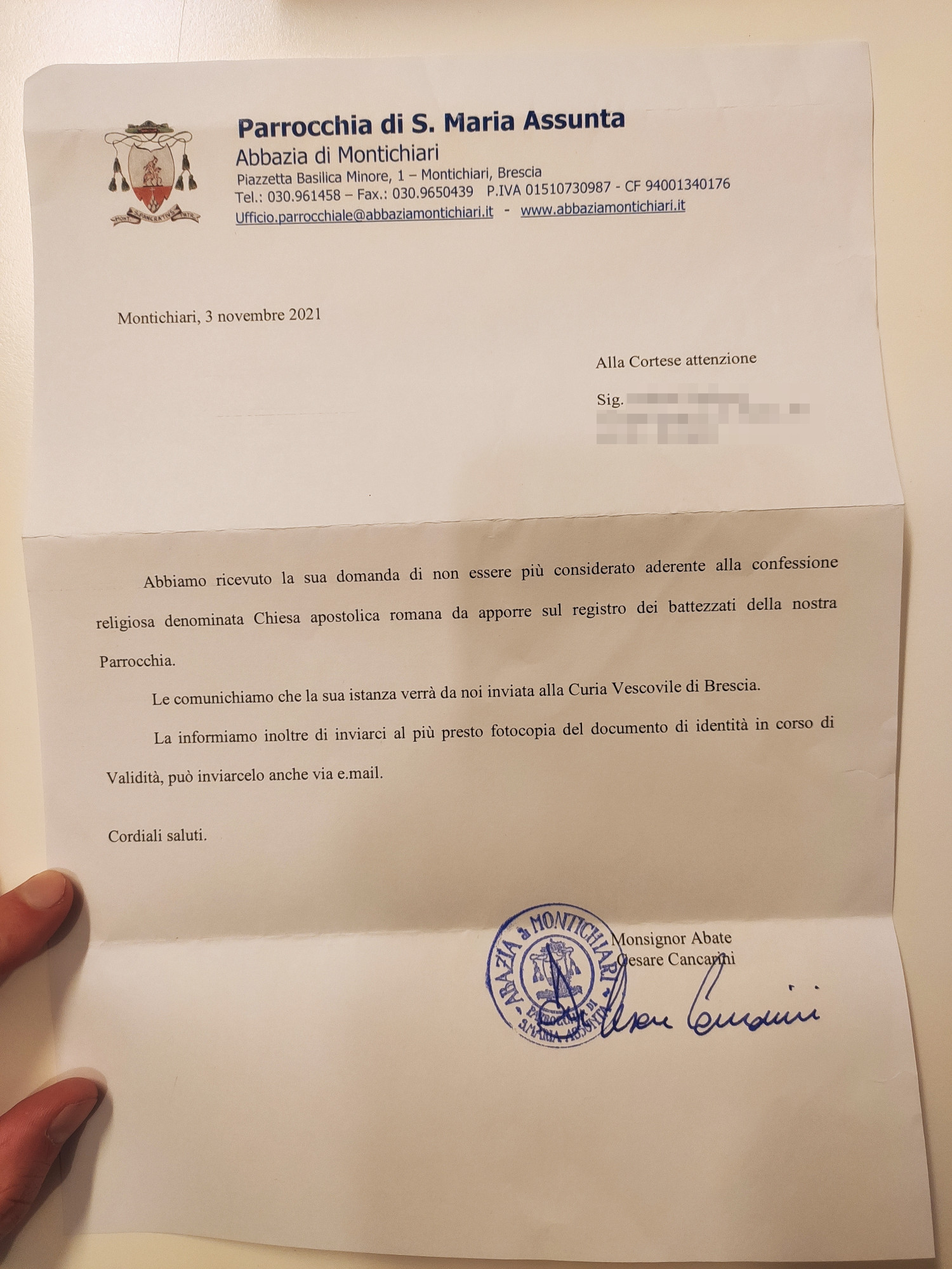 Una persona ha chiesto la rettifica dei dati relativi al proprio battesimo avvenuto a Santa Maria Assunta - MONTICHIARI (BS) il 03/11/2021, dichiarando di non voler più far parte della Chiesa Cattolica.