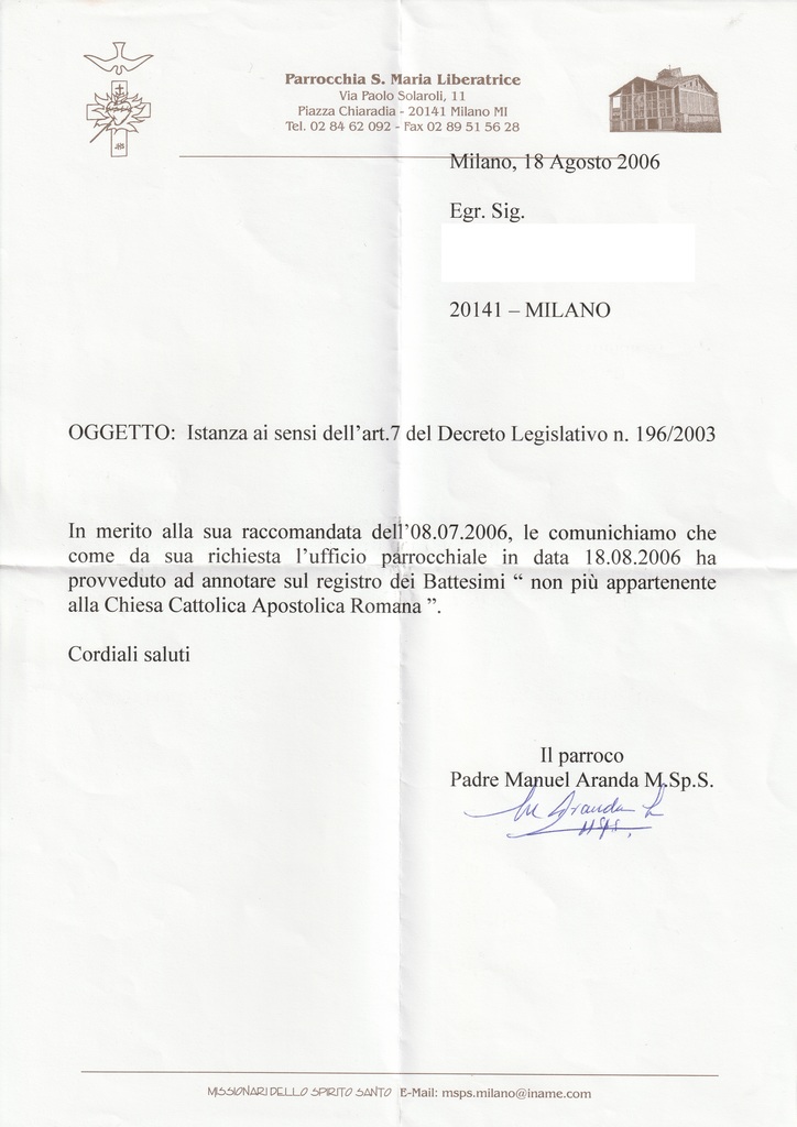 Una persona ha chiesto la rettifica dei dati relativi al proprio battesimo avvenuto a S. Maria Liberatrice - MILANO (MI) il 18/08/2006, dichiarando di non voler più far parte della Chiesa Cattolica.