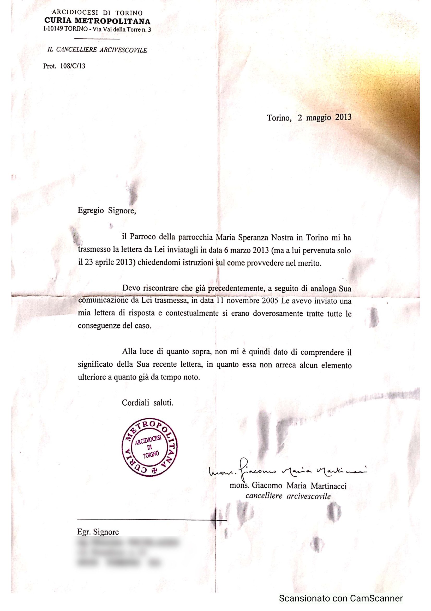 Una persona ha chiesto la rettifica dei dati relativi al proprio battesimo avvenuto a Maria Speranza Nostra - TORINO (TO) il 02/05/2013, dichiarando di non voler più far parte della Chiesa Cattolica.