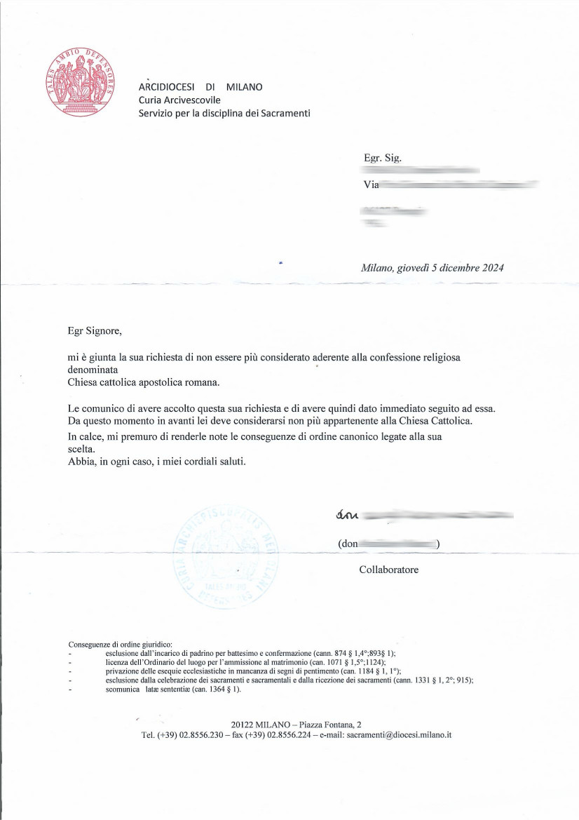Avevo già provato a sbattezzarmi una decina di anni fa ma la parrocchia mi aveva rimbalzato adducendo come scusa il fatto che non trovavano il mio nome nel registro della parrocchia, ora invece mi ha risposto direttamente l'arcidiocesi di Milano dandomi la lieta novella.