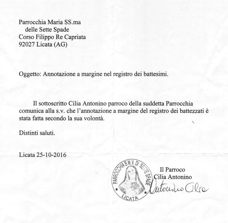 Una persona ha chiesto la rettifica dei dati relativi al proprio battesimo avvenuto a Maria Ss. delle Sette Spade - LICATA (AG) il 25/10/2016, dichiarando di non voler più far parte della Chiesa Cattolica.