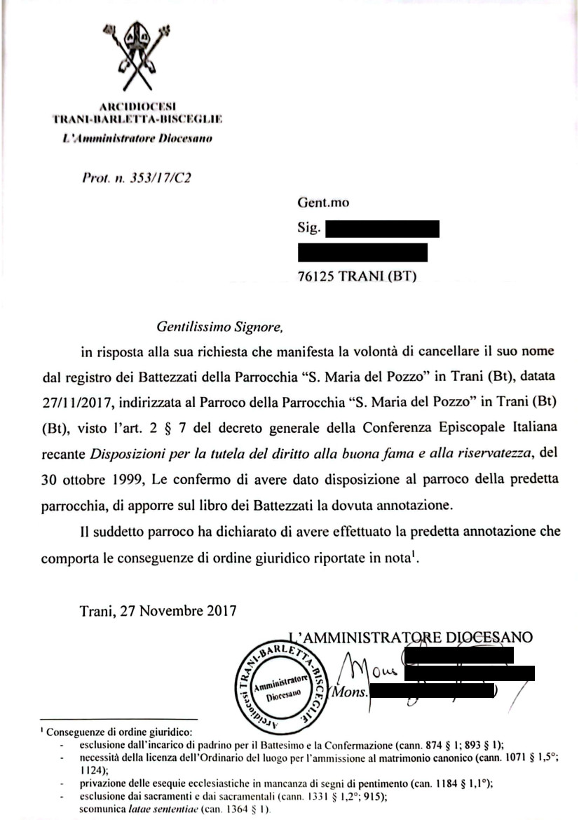 Una persona ha chiesto la rettifica dei dati relativi al proprio battesimo avvenuto a S. Maria del Pozzo - TRANI (BT) il 27/11/2017, dichiarando di non voler più far parte della Chiesa Cattolica.