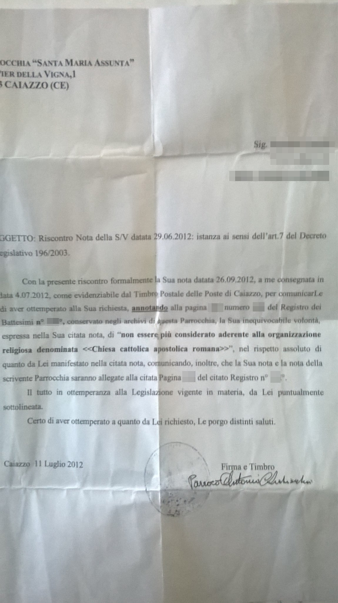 Una persona ha chiesto la rettifica dei dati relativi al proprio battesimo avvenuto a Maria Ss. Assunta - CAIAZZO (CE) il 11/07/2012, dichiarando di non voler più far parte della Chiesa Cattolica.