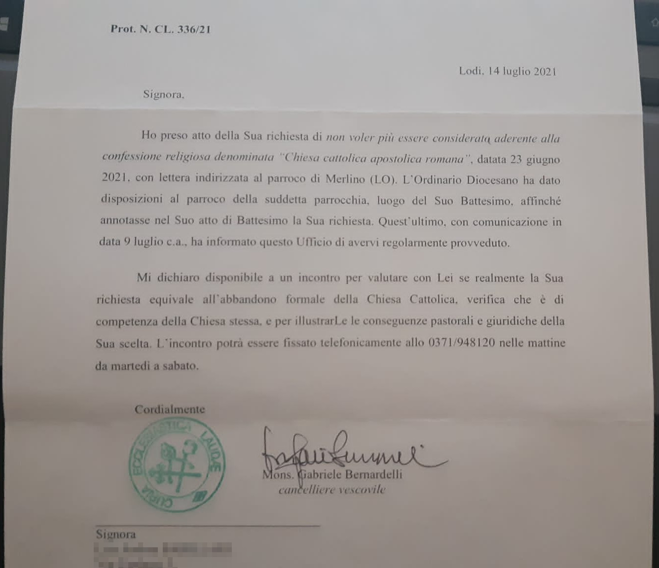 Una persona ha chiesto la rettifica dei dati relativi al proprio battesimo avvenuto a Santi Stefano e Zenone - MERLINO (LO) il 16/07/2021, dichiarando di non voler più far parte della Chiesa Cattolica.