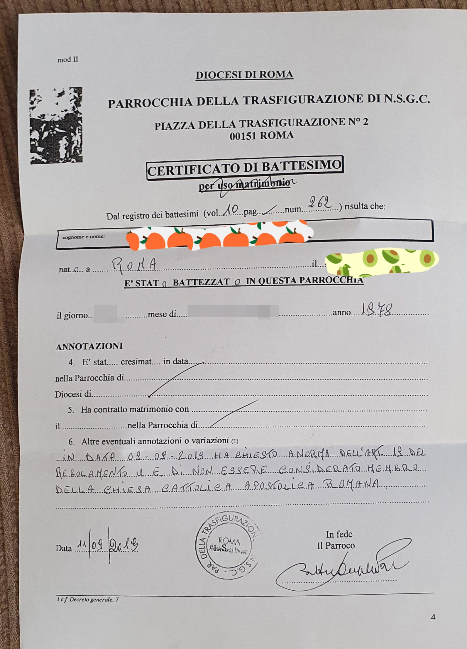Una persona ha chiesto la rettifica dei dati relativi al proprio battesimo avvenuto a Trasfigurazione di Nostro Signore Gesù Cristo - ROMA (RM) il 11/09/2019, dichiarando di non voler più far parte della Chiesa Cattolica.