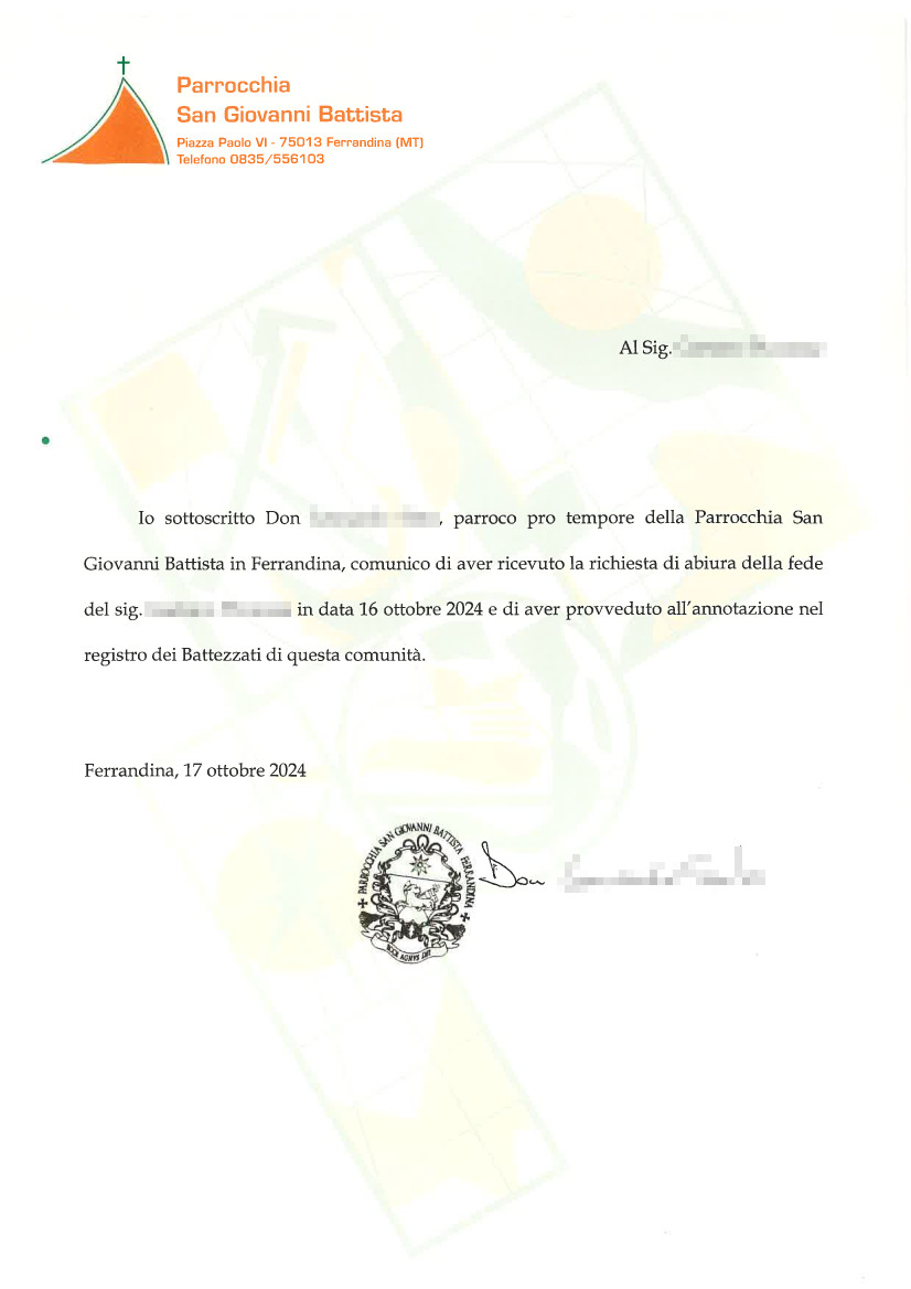 Una persona ha chiesto la rettifica dei dati relativi al proprio battesimo avvenuto a S. Giovanni Battista - FERRANDINA (MT) il 17/10/2024, dichiarando di non voler più far parte della Chiesa Cattolica.