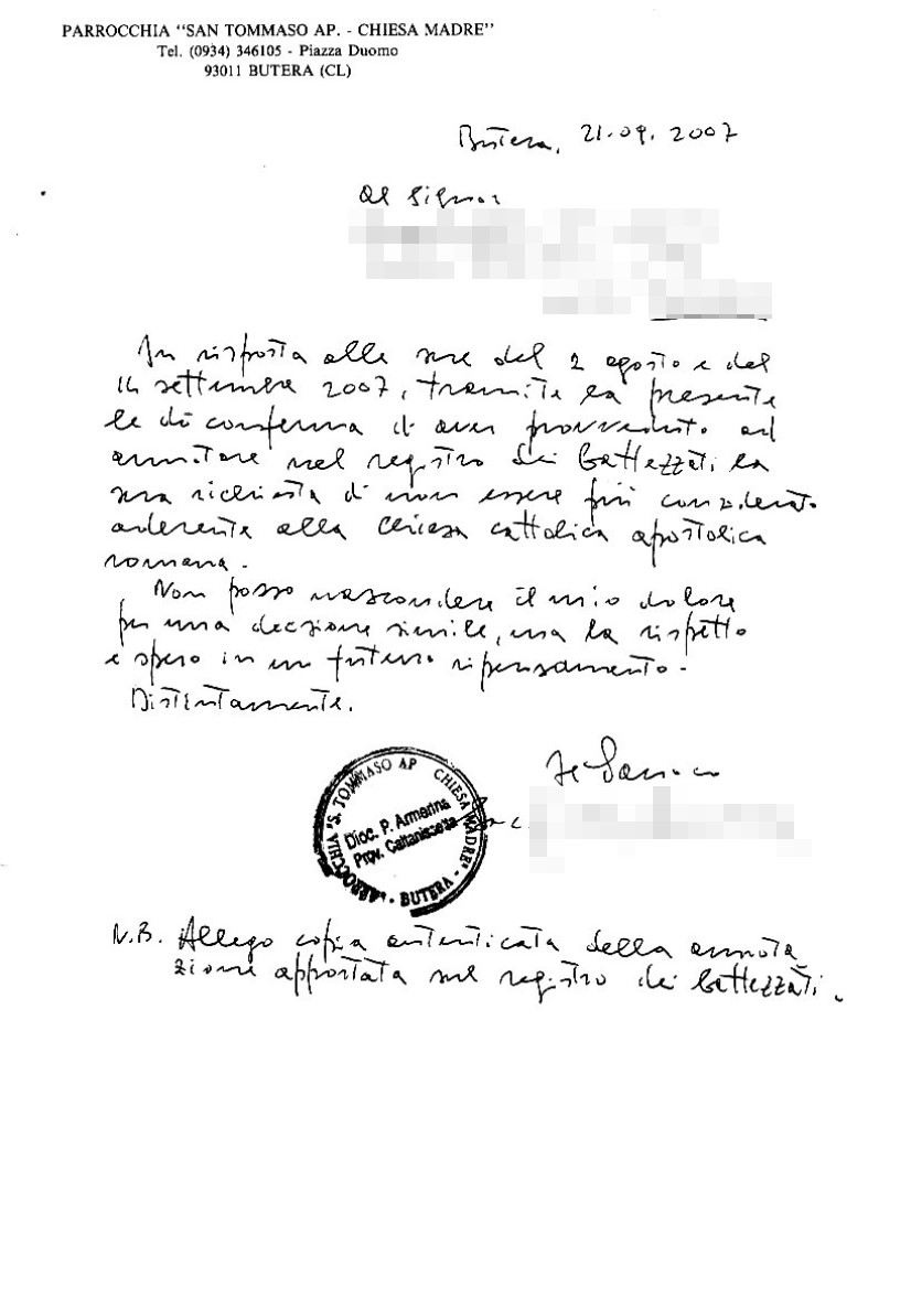 Una persona ha chiesto la rettifica dei dati relativi al proprio battesimo avvenuto a S. Tommaso Chiesa - BUTERA (CL) il 21/09/2007, dichiarando di non voler più far parte della Chiesa Cattolica.