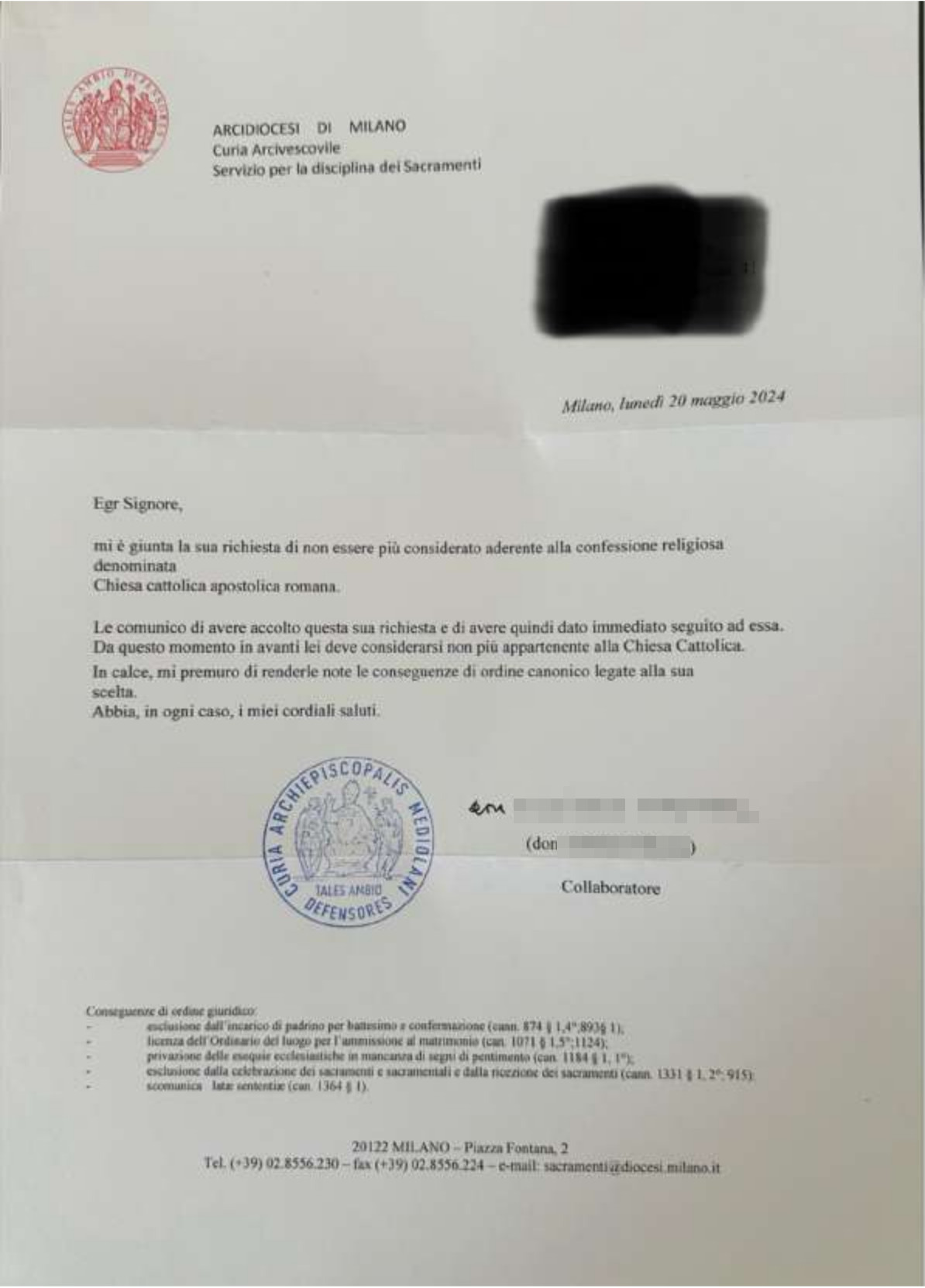 Una persona ha chiesto la rettifica dei dati relativi al proprio battesimo avvenuto a S. Maria del Buon Consiglio - MILANO (MI) il 20/05/2024, dichiarando di non voler più far parte della Chiesa Cattolica.