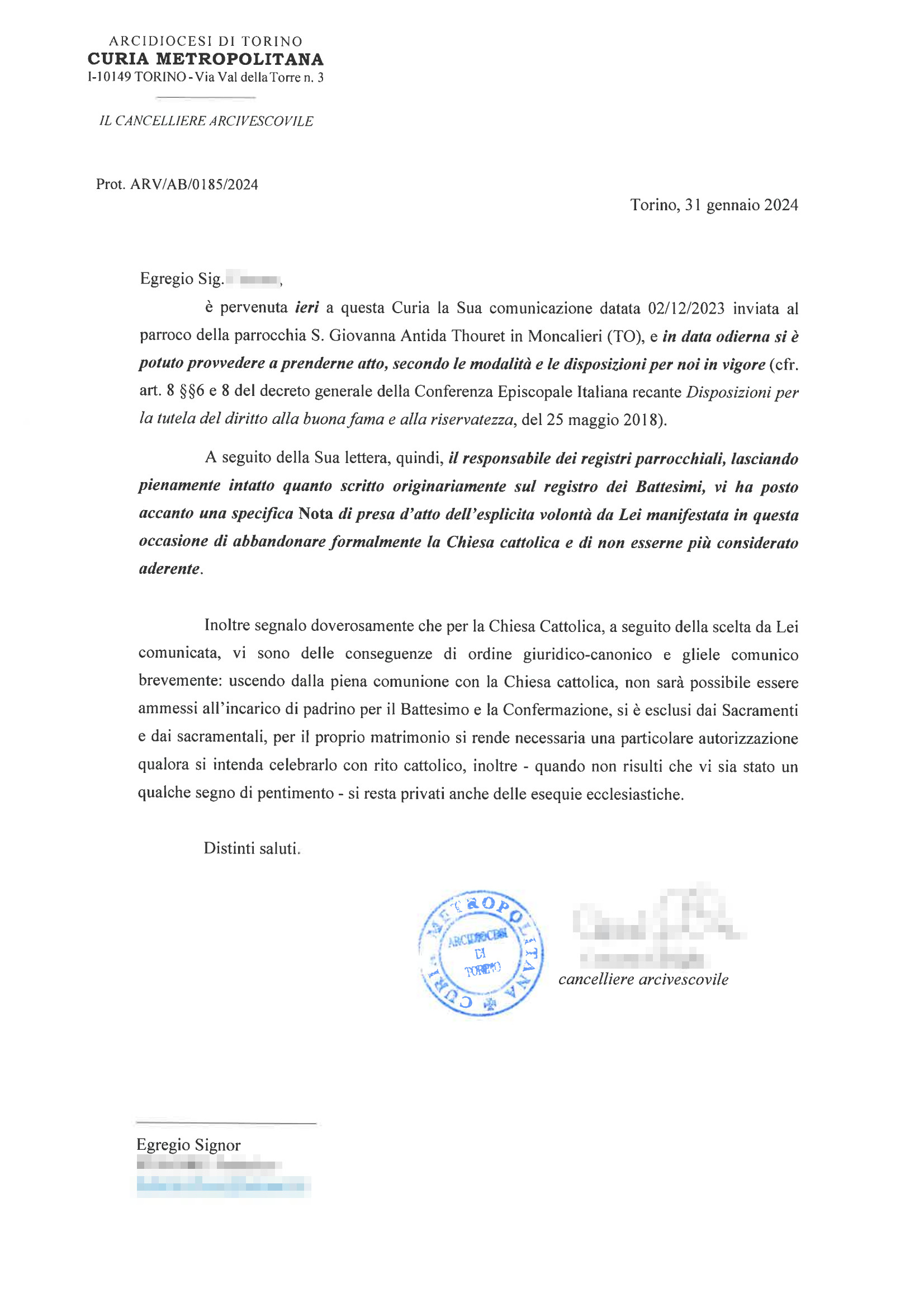 Una persona ha chiesto la rettifica dei dati relativi al proprio battesimo avvenuto a S. Giovanna Antida Thouret - MONCALIERI (TO) il 31/01/2024, dichiarando di non voler più far parte della Chiesa Cattolica.