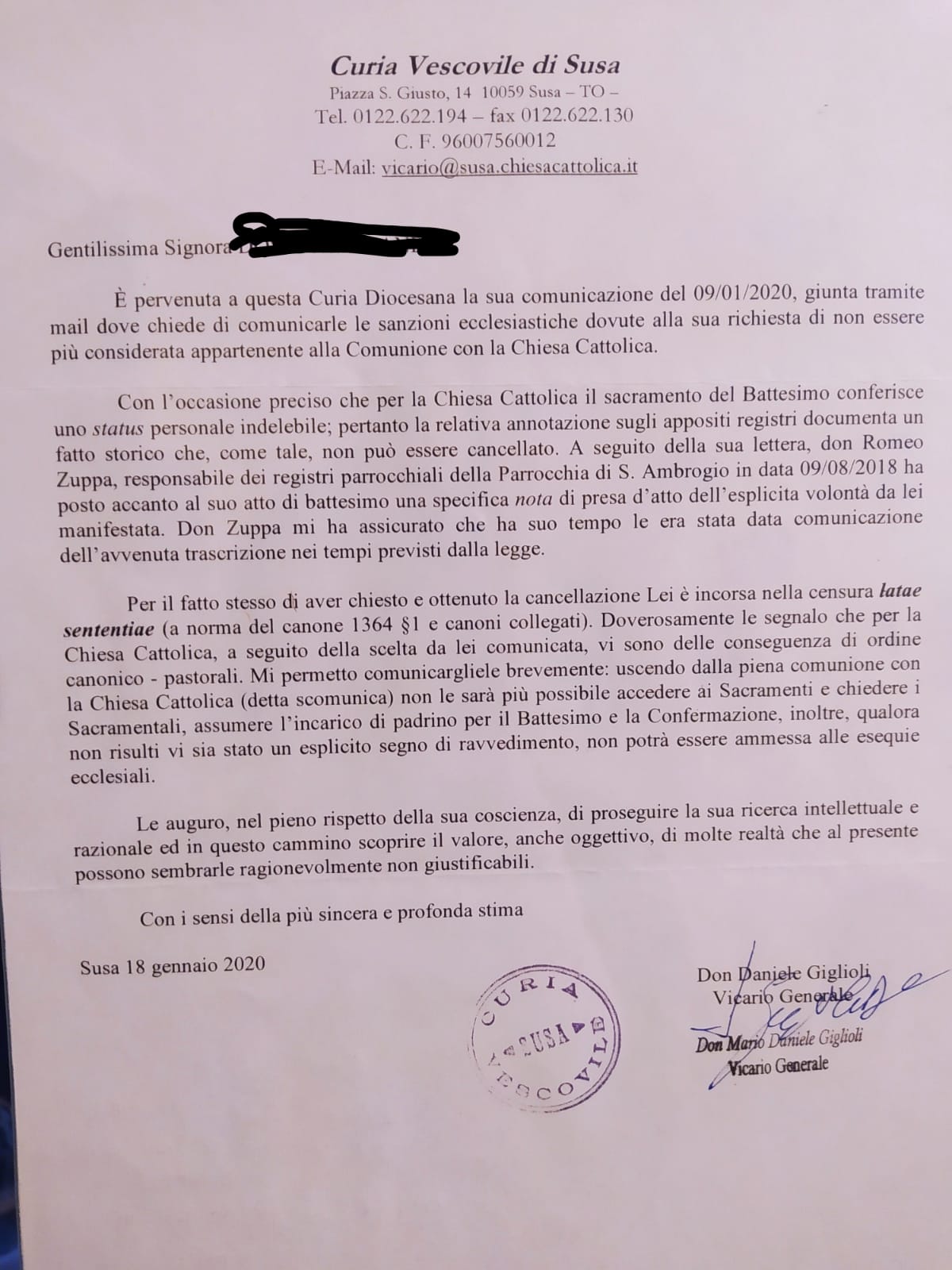 Il parroco a suo tempo mi scrisse un'accorata lettera di risposta in cui mi assicurava di aver annotato la mai volontà sul registro battesimale. Io però, desiderosa della lettera di scomunica mi sono rivolta alla curia vescovile di Susa (dalla quale dipende la parrocchia del mio paese) a gennaio 2020, e dopo circa un mese mi è arrivata la scomunica.