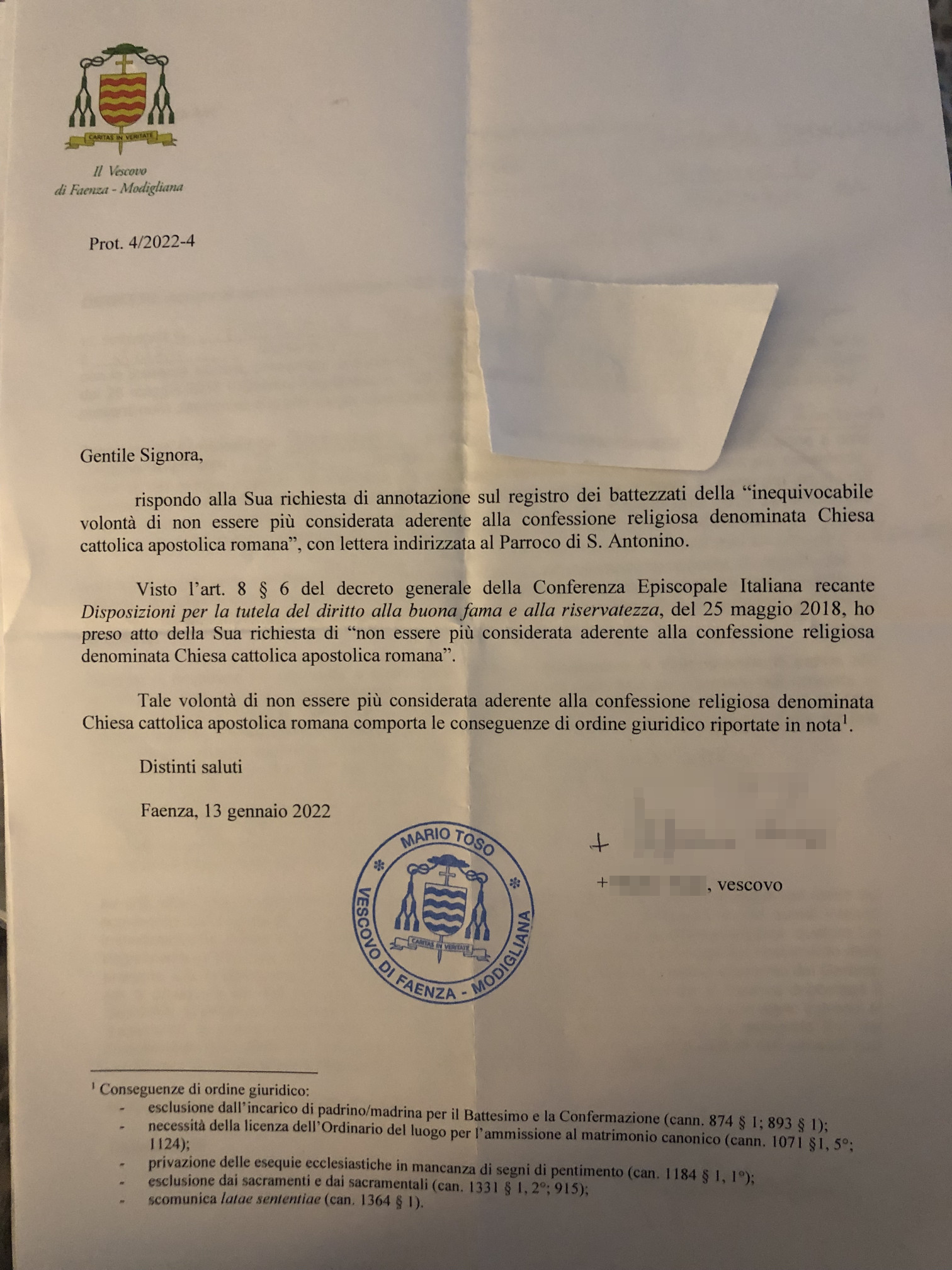 Una persona ha chiesto la rettifica dei dati relativi al proprio battesimo avvenuto a S. Antonino - FAENZA (RA) il 13/01/2022, dichiarando di non voler più far parte della Chiesa Cattolica.