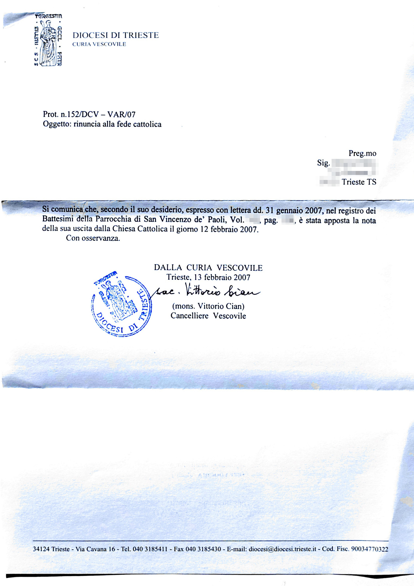 Una persona ha chiesto la rettifica dei dati relativi al proprio battesimo avvenuto a S. Vincenzo de' Paoli - TRIESTE (TS) il 12/02/2007, dichiarando di non voler più far parte della Chiesa Cattolica.