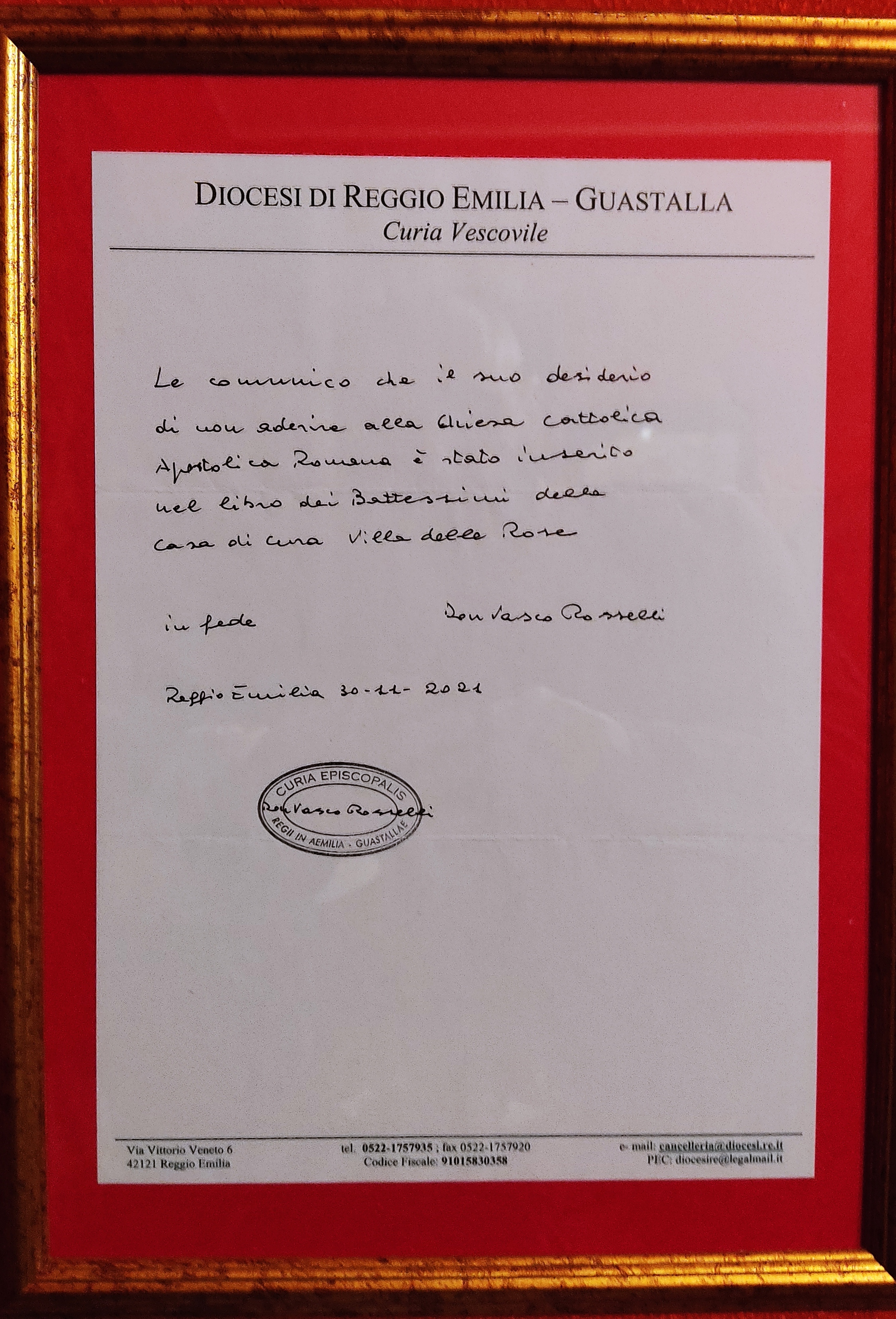 Una persona ha chiesto la rettifica dei dati relativi al proprio battesimo avvenuto a Villa Salus / Villa delle Rose - REGGIO NELL'EMILIA (RE) il 30/11/2021, dichiarando di non voler più far parte della Chiesa Cattolica.