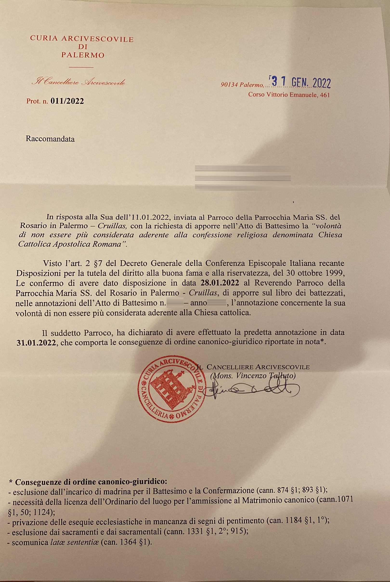 Una persona ha chiesto la rettifica dei dati relativi al proprio battesimo avvenuto a Maria Ss. del Rosario - PALERMO (PA) il 31/01/2022, dichiarando di non voler più far parte della Chiesa Cattolica.