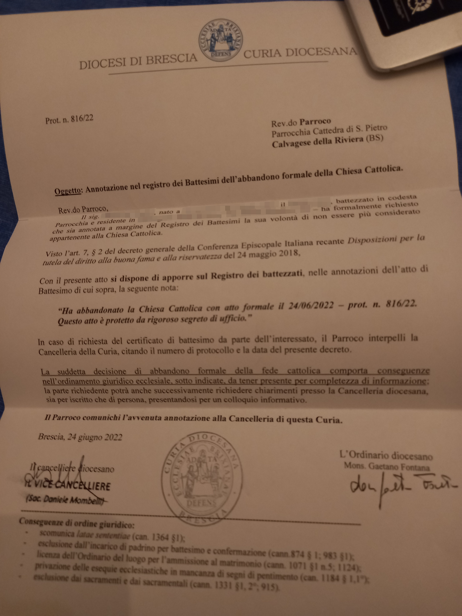 Una persona ha chiesto la rettifica dei dati relativi al proprio battesimo avvenuto a Cattedra di S. Pietro - CALVAGESE DELLA RIVIERA (BS) il 05/07/2022, dichiarando di non voler più far parte della Chiesa Cattolica.