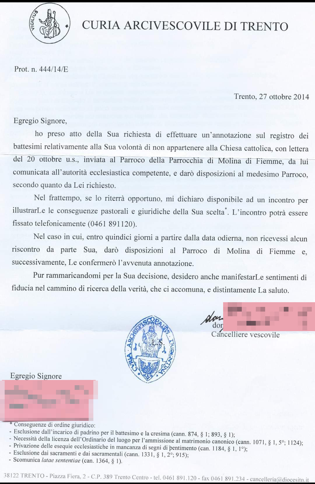 Una persona ha chiesto la rettifica dei dati relativi al proprio battesimo avvenuto a S. Antonio di Padova - MOLINA DI FIEMME (TN) il 27/10/2014, dichiarando di non voler più far parte della Chiesa Cattolica.