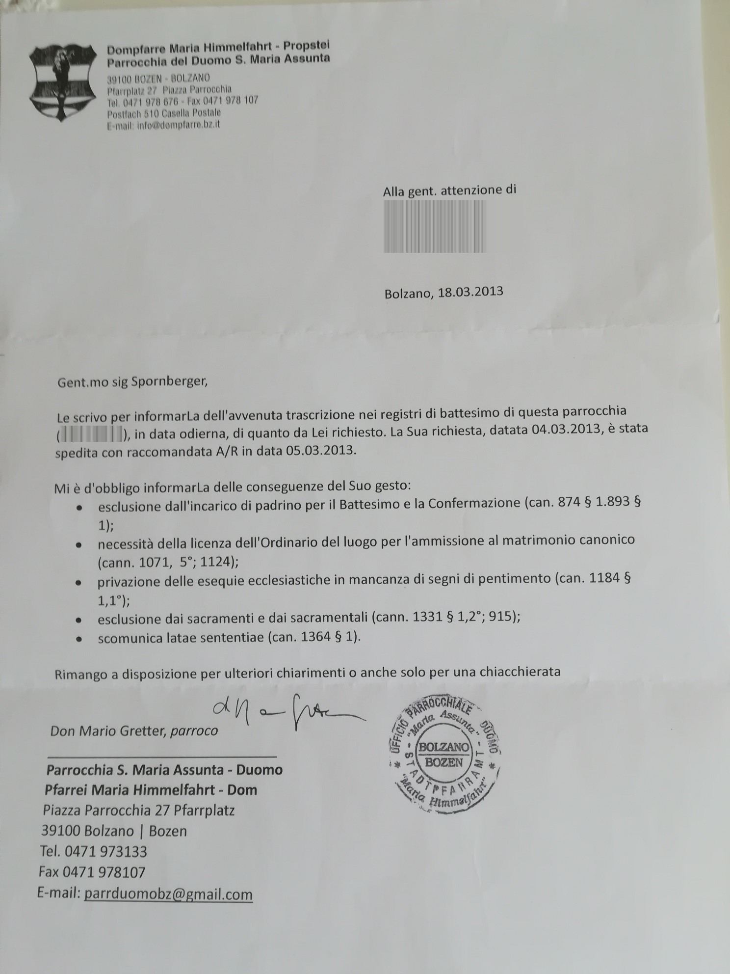 Una persona ha chiesto la rettifica dei dati relativi al proprio battesimo avvenuto a S. Maria Assunta (Duomo) - BOLZANO (BZ) il 18/03/2013, dichiarando di non voler più far parte della Chiesa Cattolica.