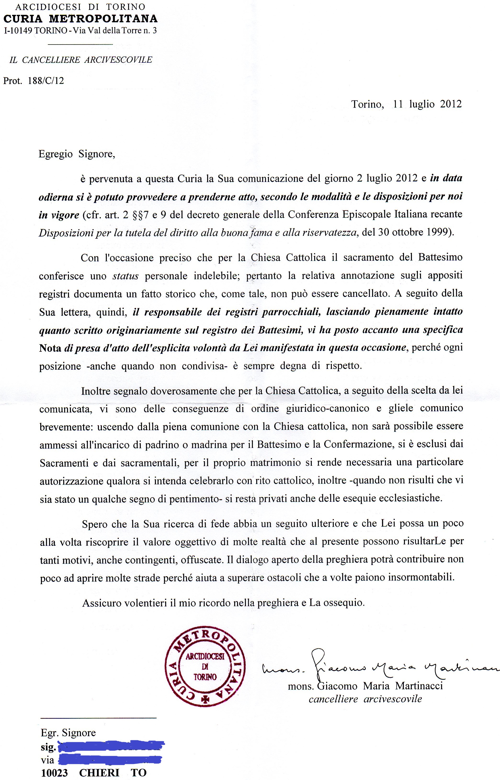 Una persona ha chiesto la rettifica dei dati relativi al proprio battesimo avvenuto a Madonna delle Rose - TORINO (TO) il 11/07/2012, dichiarando di non voler più far parte della Chiesa Cattolica.