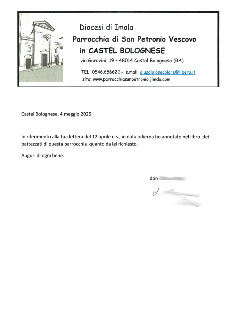 Una persona ha chiesto la rettifica dei dati relativi al proprio battesimo avvenuto a S. Petronio Vescovo in Castel Bolognese - CASTEL BOLOGNESE (RA) il 04/05/2025, dichiarando di non voler più far parte della Chiesa Cattolica.