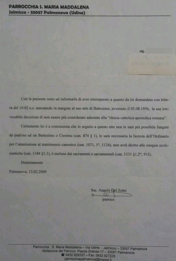Una persona ha chiesto la rettifica dei dati relativi al proprio battesimo avvenuto a Santa Maria Maddalena - PALMANOVA (UD) il 13/02/2008, dichiarando di non voler più far parte della Chiesa Cattolica.