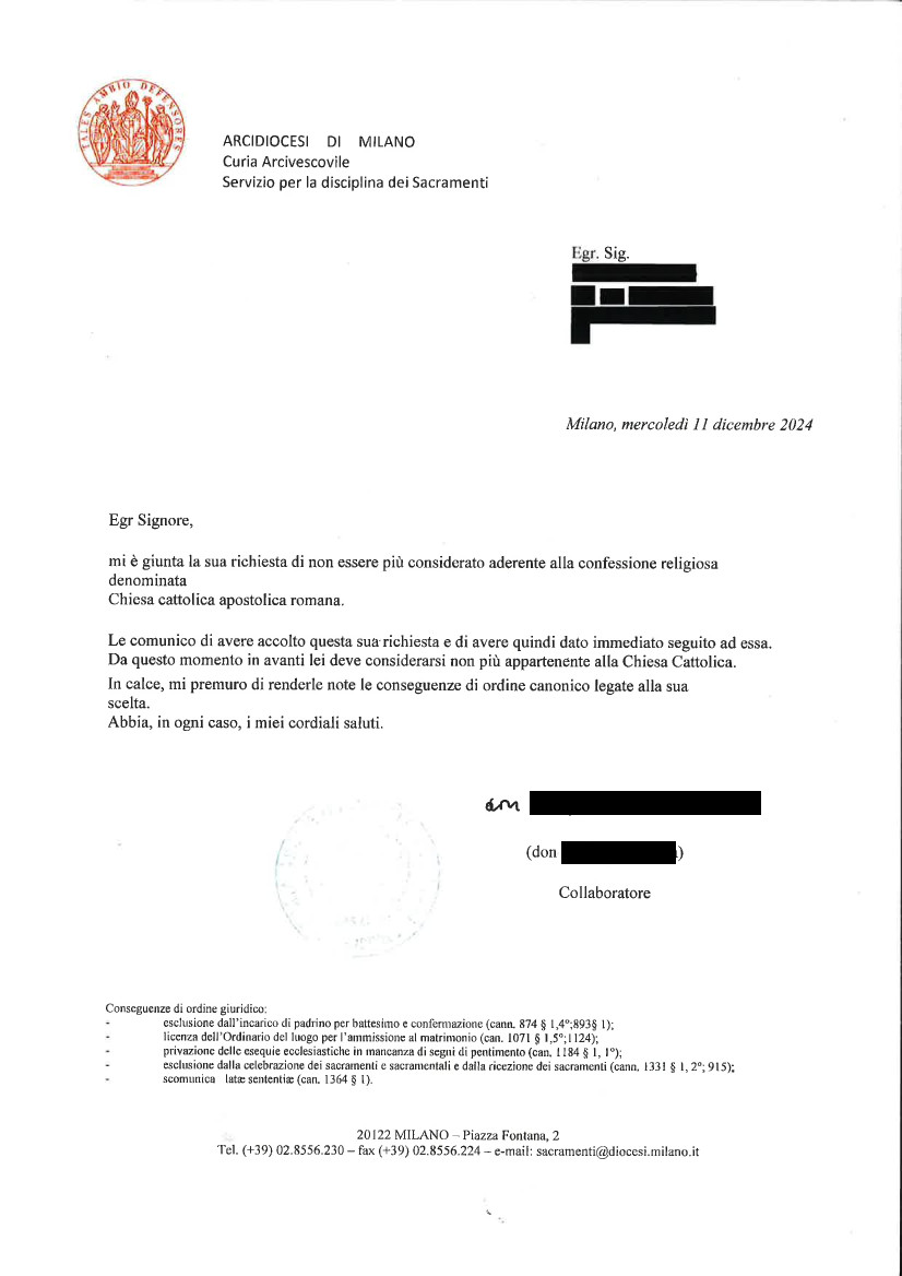 Una persona ha chiesto la rettifica dei dati relativi al proprio battesimo avvenuto a S. Giovanni Battista - MOTTA VISCONTI (MI) il 11/12/2024, dichiarando di non voler più far parte della Chiesa Cattolica.