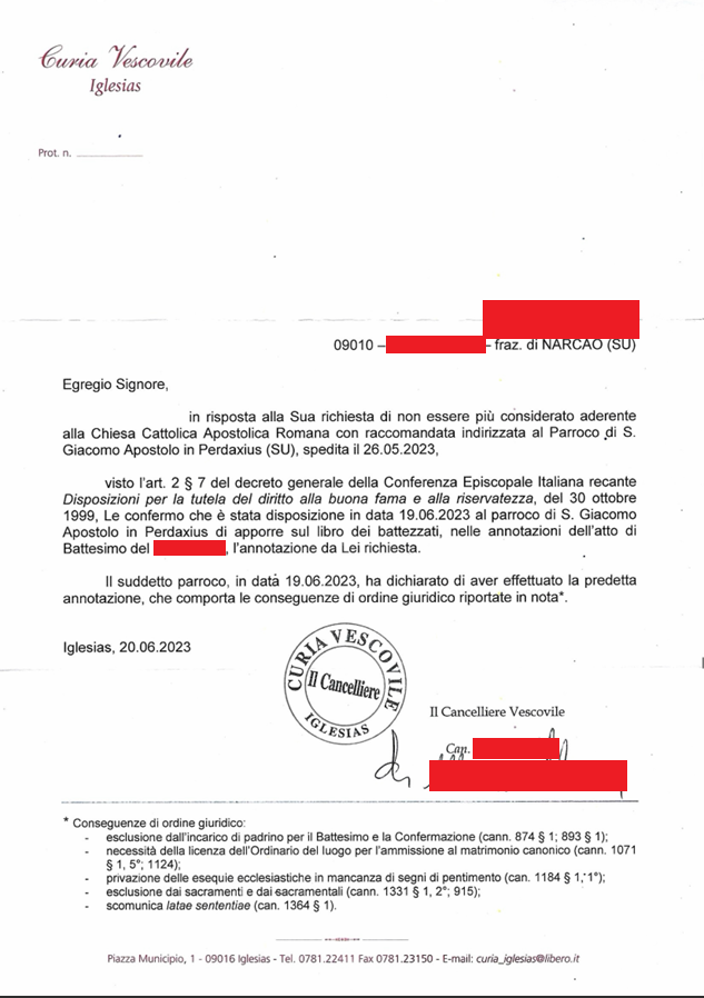 Una persona ha chiesto la rettifica dei dati relativi al proprio battesimo avvenuto a S. Giuseppe - NARCAO (SU) il 19/06/2023, dichiarando di non voler più far parte della Chiesa Cattolica.