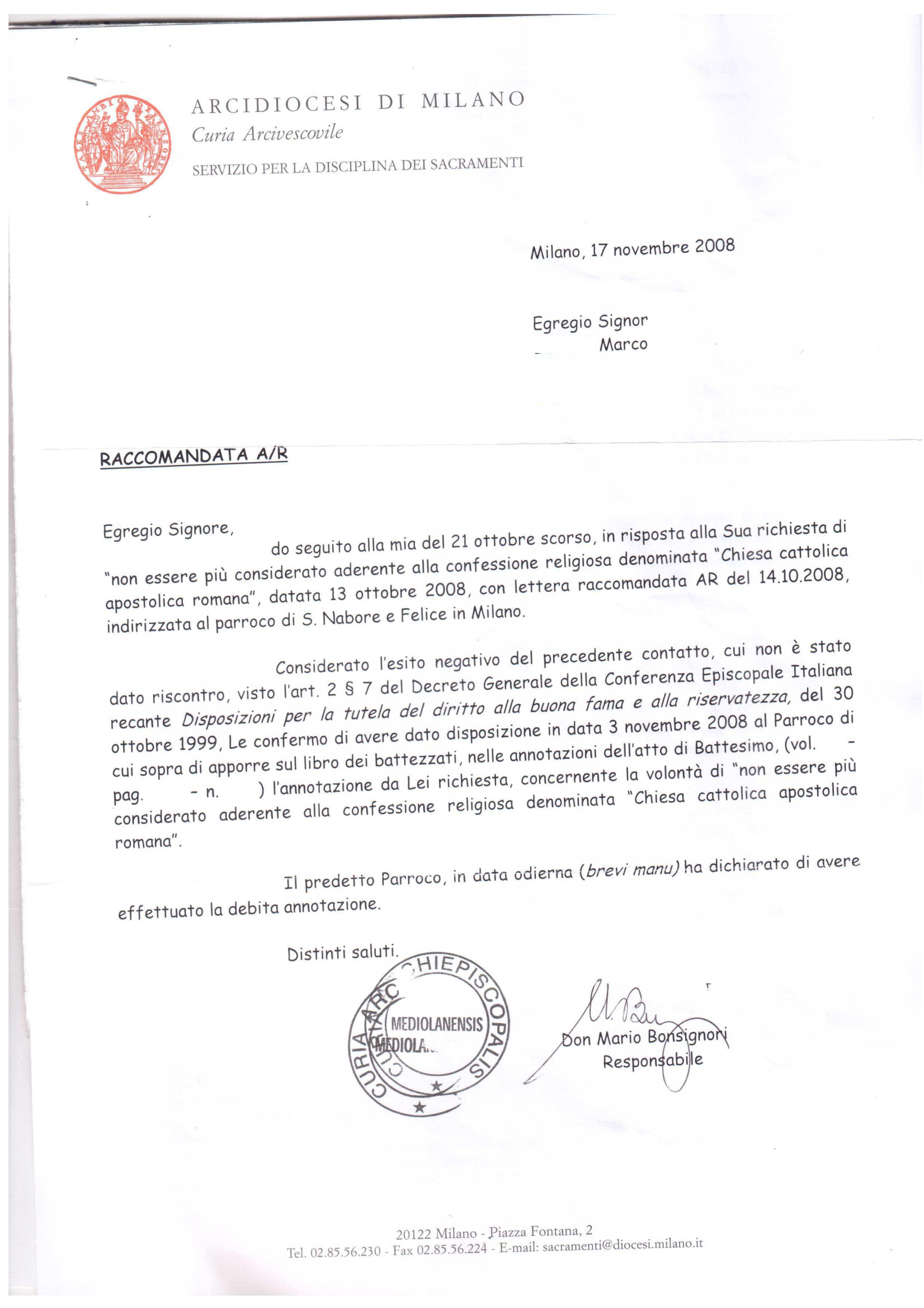 Una persona ha chiesto la rettifica dei dati relativi al proprio battesimo avvenuto a Santi Mm. Nabore e Felice - MILANO (MI) il 17/11/2008, dichiarando di non voler più far parte della Chiesa Cattolica.