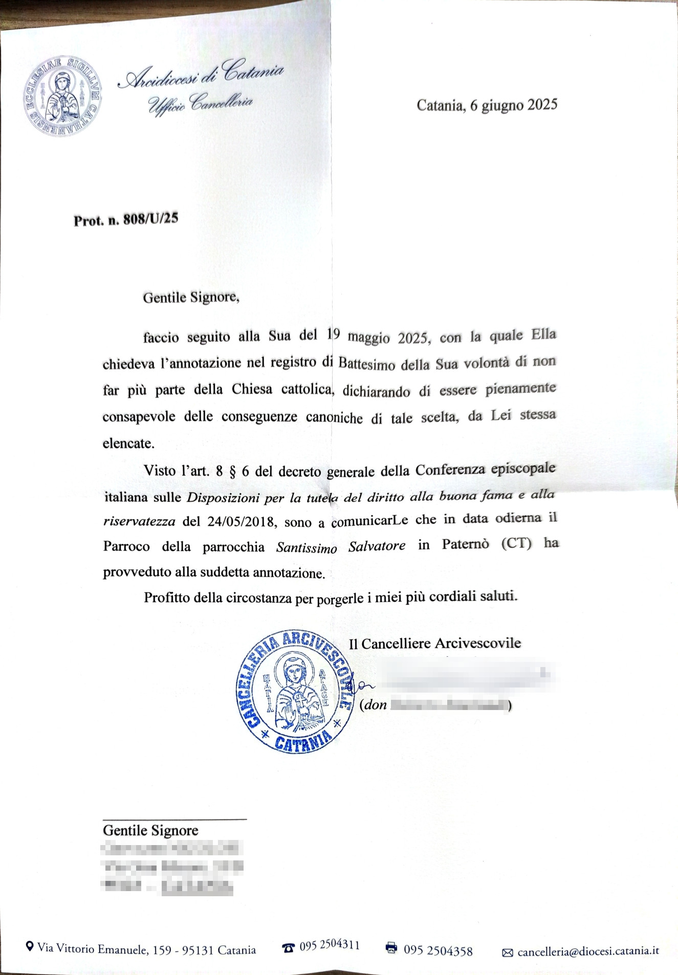 Una persona ha chiesto la rettifica dei dati relativi al proprio battesimo avvenuto a Ss. Salvatore - PATERNÒ (CT) il 06/06/2025, dichiarando di non voler più far parte della Chiesa Cattolica.
