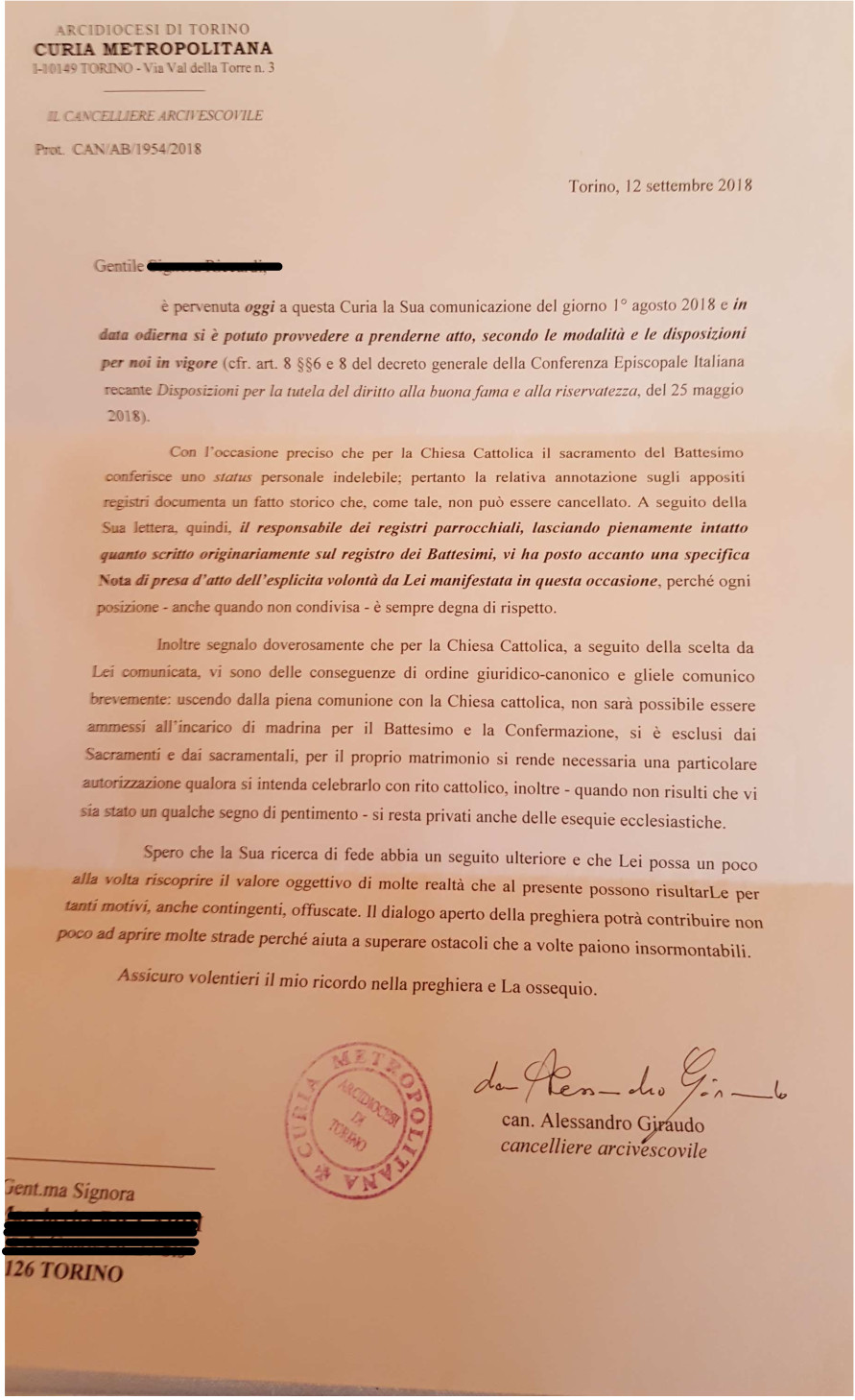 Una persona ha chiesto la rettifica dei dati relativi al proprio battesimo avvenuto a S. Agostino - RIMINI (RN) il 28/08/2012, dichiarando di non voler più far parte della Chiesa Cattolica.