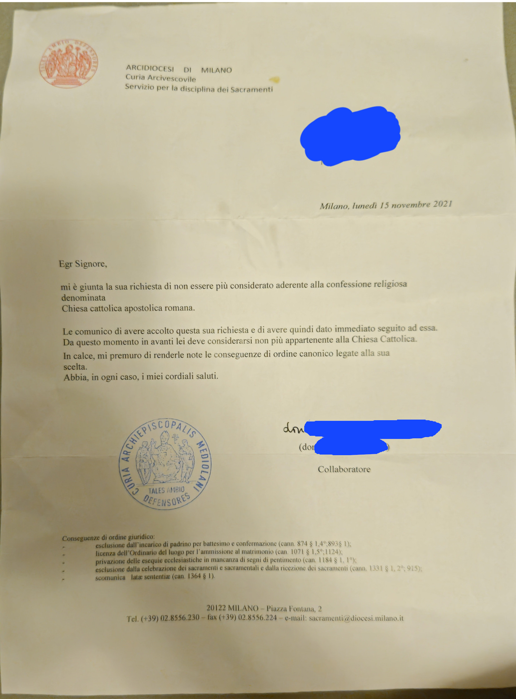 Una persona ha chiesto la rettifica dei dati relativi al proprio battesimo avvenuto a Santi Pietro e Paolo - SARONNO (VA) il 15/11/2021, dichiarando di non voler più far parte della Chiesa Cattolica.