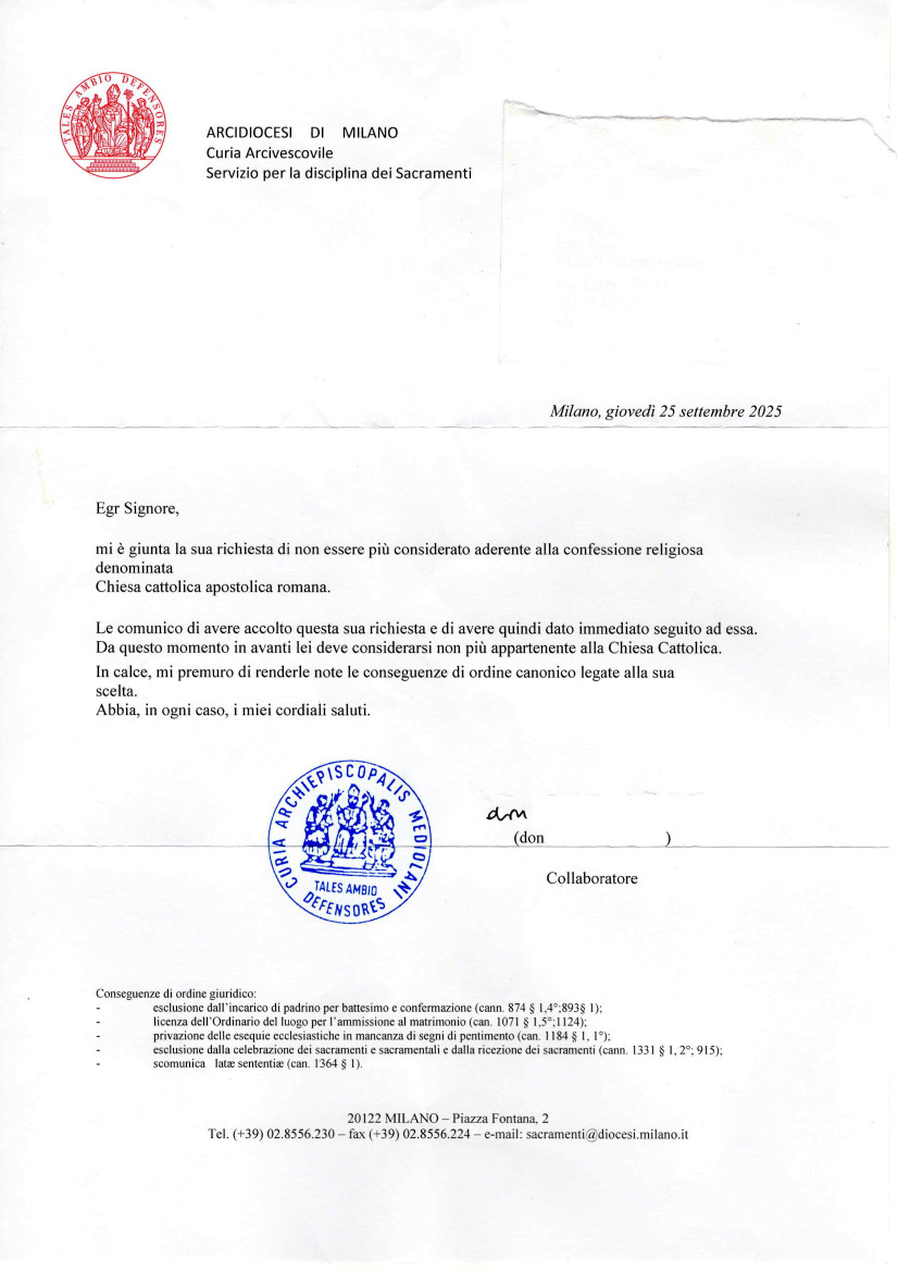 Una persona ha chiesto la rettifica dei dati relativi al proprio battesimo avvenuto a San Martino - BOLLATE (MI) il 03/10/2025, dichiarando di non voler più far parte della Chiesa Cattolica.