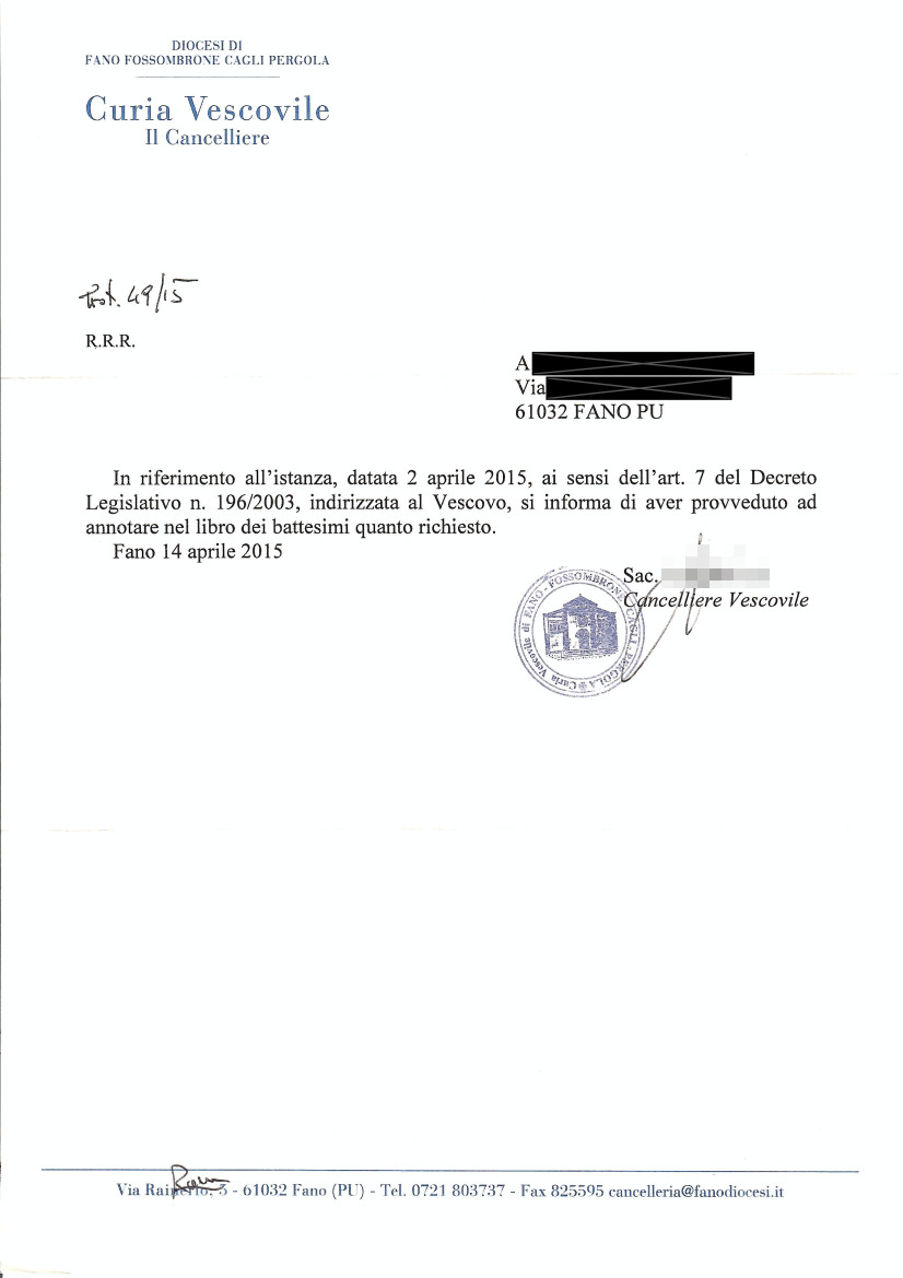 Una persona ha chiesto la rettifica dei dati relativi al proprio battesimo avvenuto a Ospedale Santa Croce - FANO (PU) il 14/04/2015, dichiarando di non voler più far parte della Chiesa Cattolica.