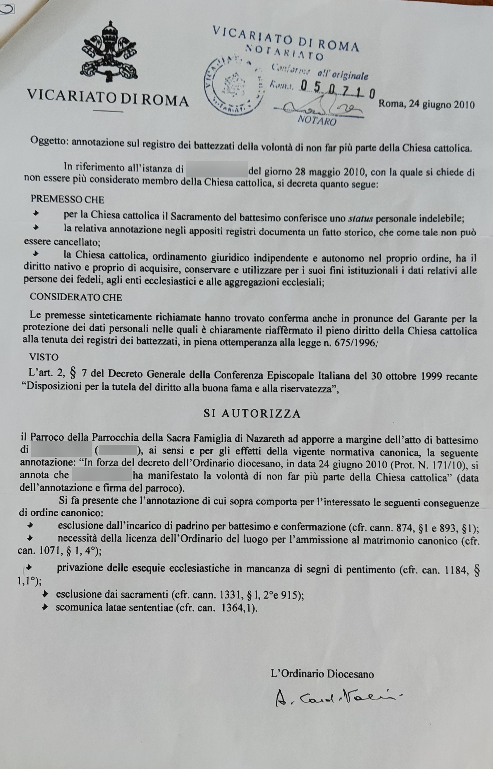 Una persona ha chiesto la rettifica dei dati relativi al proprio battesimo avvenuto a S. Famiglia di Nazareth a Centocelle - ROMA (RM) il 24/06/2010, dichiarando di non voler più far parte della Chiesa Cattolica.
