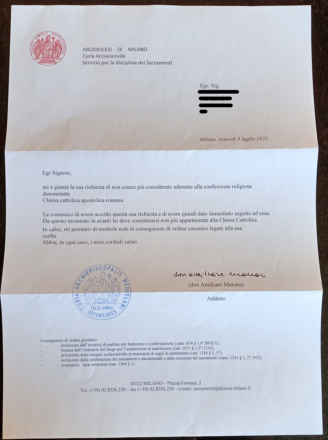 Una persona ha chiesto la rettifica dei dati relativi al proprio battesimo avvenuto a S. Giovanni in Laterano - MILANO (MI) il 09/07/2021, dichiarando di non voler più far parte della Chiesa Cattolica.