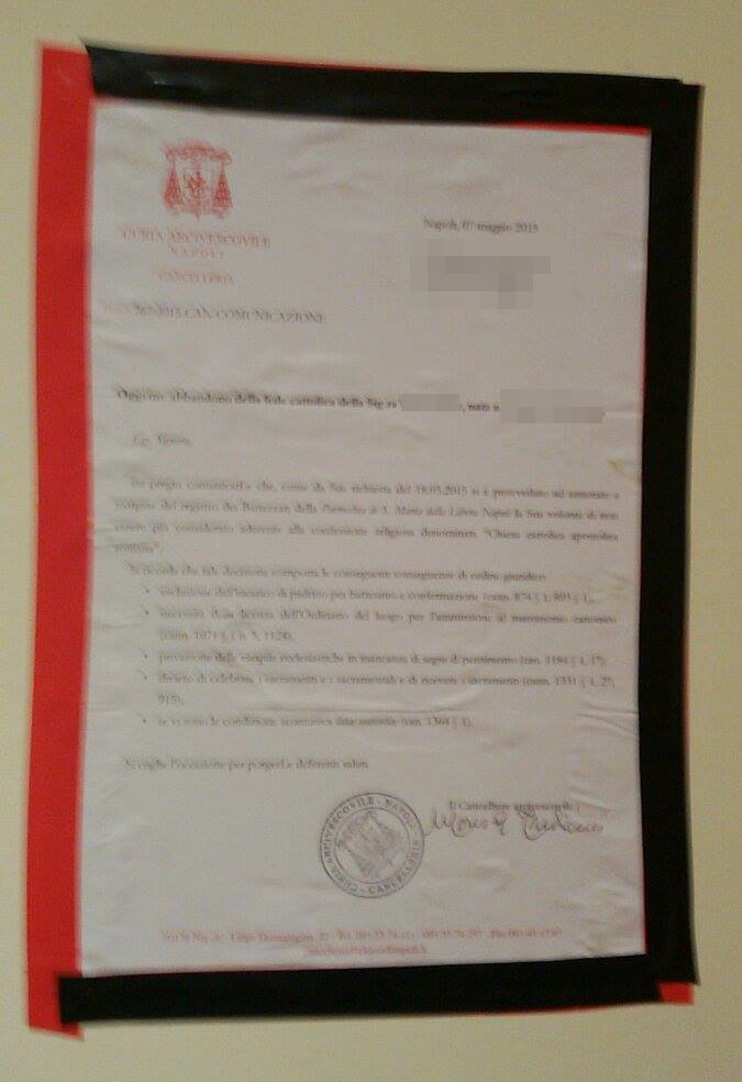Una persona ha chiesto la rettifica dei dati relativi al proprio battesimo avvenuto a S. Maria della Libera - NAPOLI (NA) il 01/05/2015, dichiarando di non voler più far parte della Chiesa Cattolica.