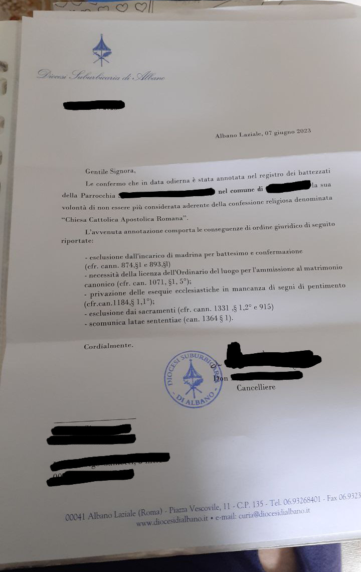 Ho mandato la raccomandata A/R il 7 Maggio 2023, ma ho ricevuto l'avviso di ricevimento solo il 3 giugno dello stesso anno. Per fortuna non ho dovuto aspettare di più: il 7 dello stesso mese mi arriva la raccomandata di risposta in cui il parroco ha notificato l'avvenuto "sbattezzo" con il classico modulo pre-fatto. Va bene così, non ha aggiunto orpelli non richiesti come richieste di denaro o di ripensarci, lo apprezzo.