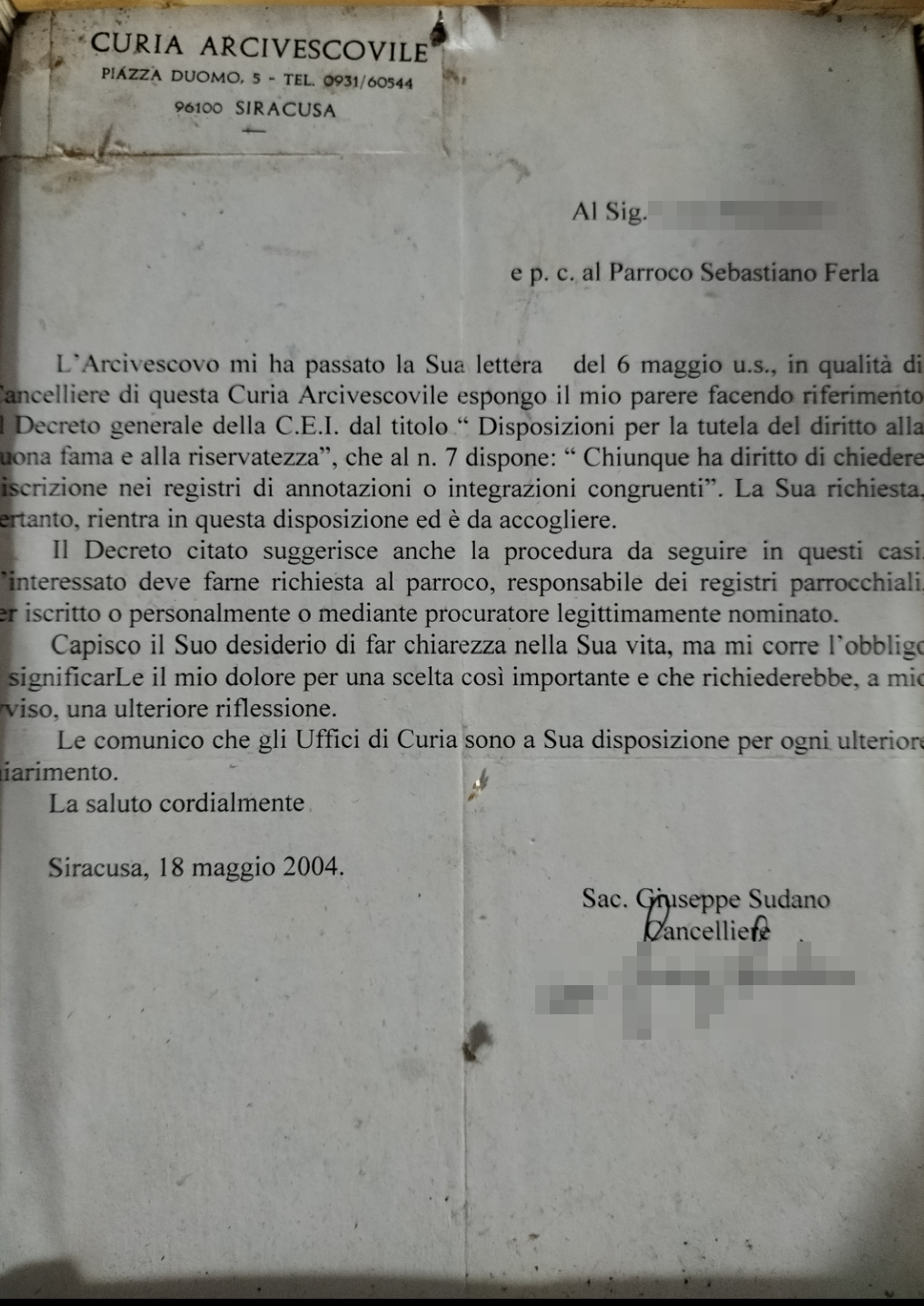 Una persona ha chiesto la rettifica dei dati relativi al proprio battesimo avvenuto a Maria Ss. Ausiliatrice - CANICATTINI BAGNI (SR) il 18/05/2004, dichiarando di non voler più far parte della Chiesa Cattolica.