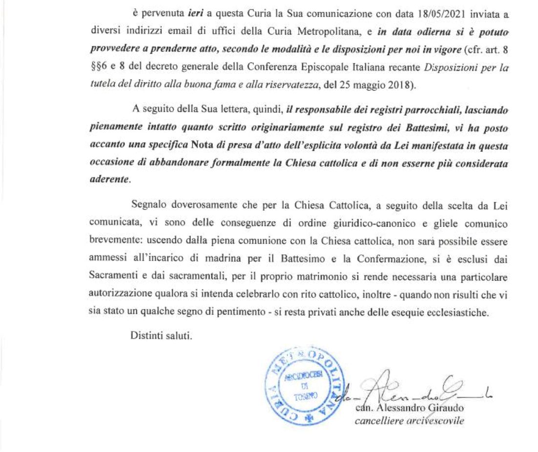 Una persona ha chiesto la rettifica dei dati relativi al proprio battesimo avvenuto a S. Nicola Vescovo - ALA DI STURA (TO) il 19/05/2021, dichiarando di non voler più far parte della Chiesa Cattolica.