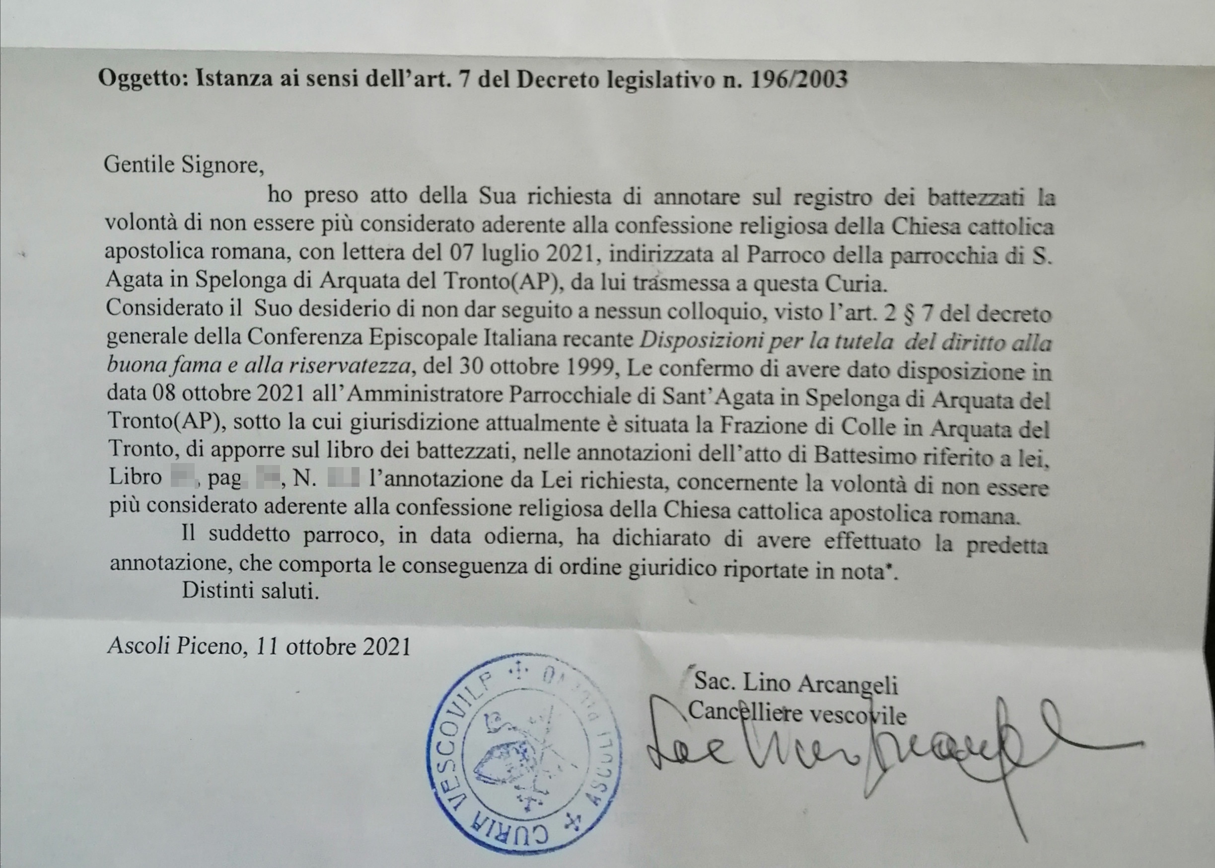 Una persona ha chiesto la rettifica dei dati relativi al proprio battesimo avvenuto a S. Agata - ARQUATA DEL TRONTO (AP) il 11/10/2021, dichiarando di non voler più far parte della Chiesa Cattolica.