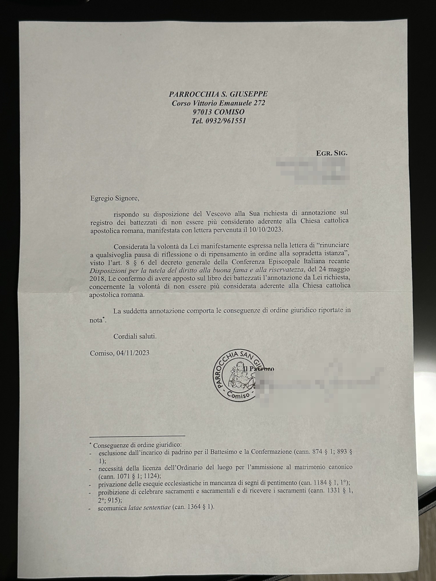 Una persona ha chiesto la rettifica dei dati relativi al proprio battesimo avvenuto a San Giuseppe - COMISO (RG) il 08/11/2023, dichiarando di non voler più far parte della Chiesa Cattolica.